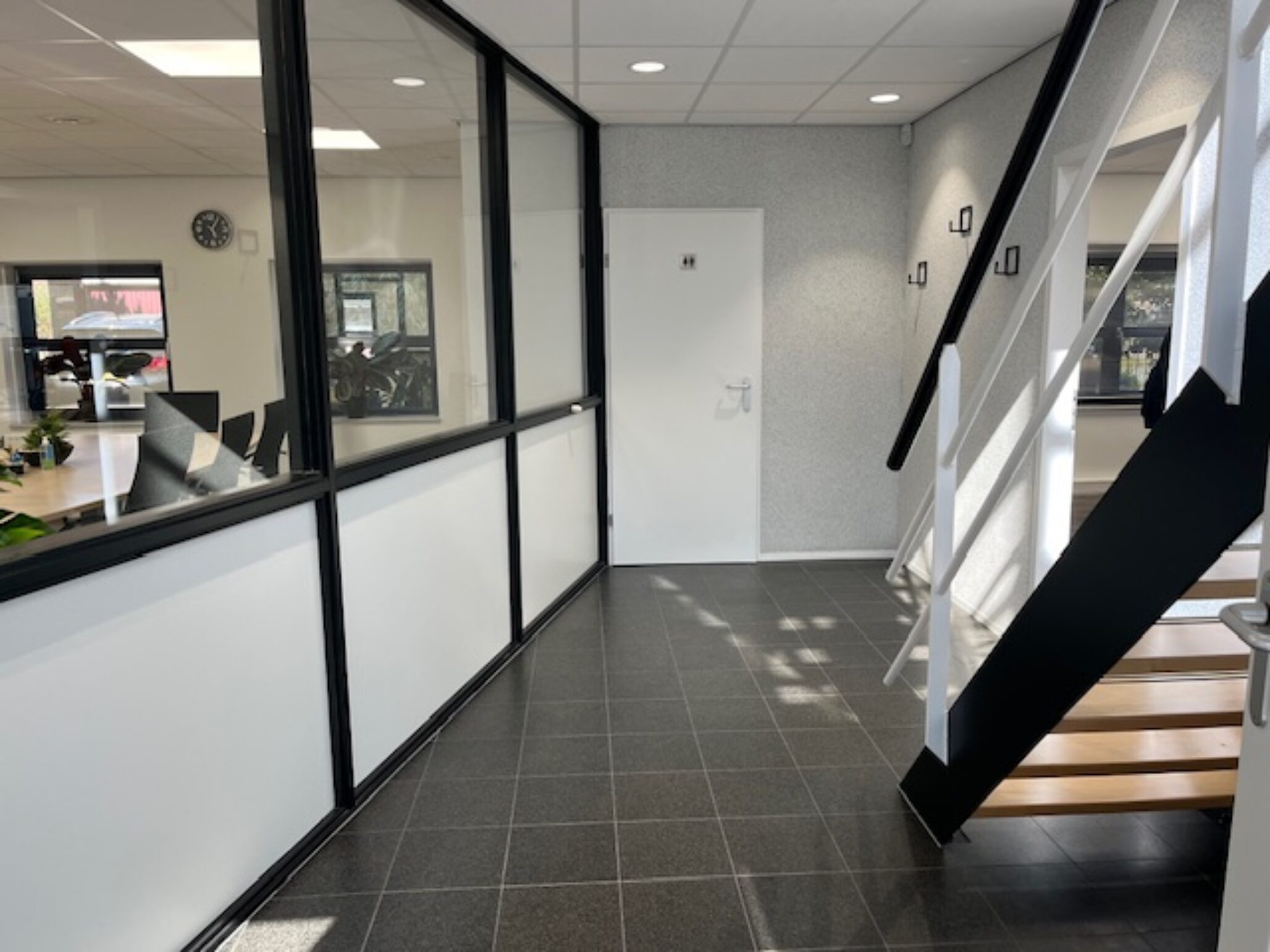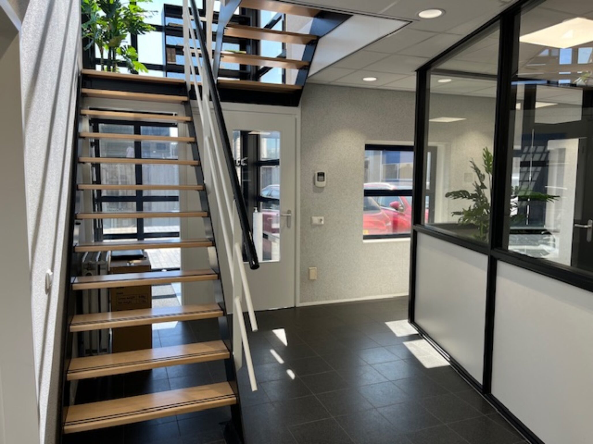 Parterre ca. 120 m², mooie glazen entree met trapopgang, centrale hal met sanitaire groep, 2 kantoorruimtes, kantine met keukenblok.