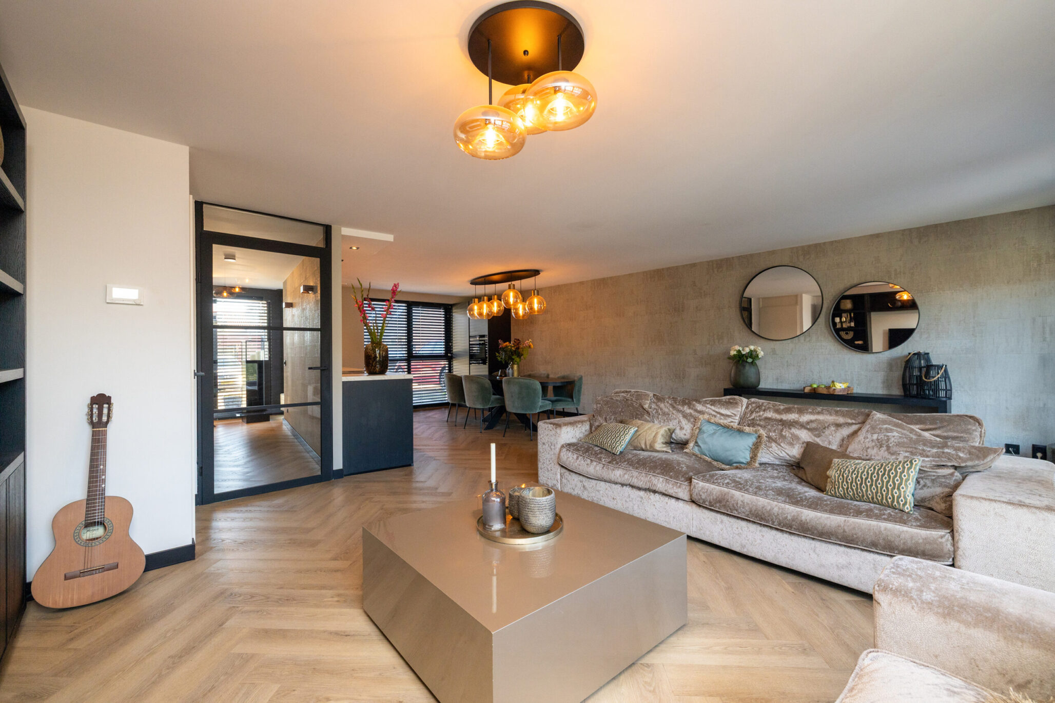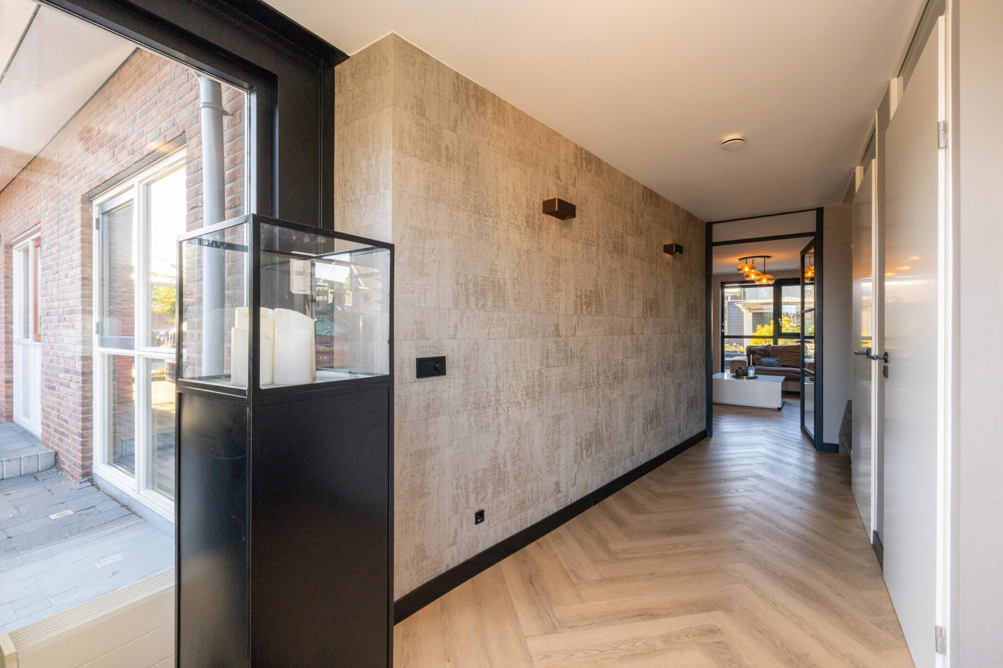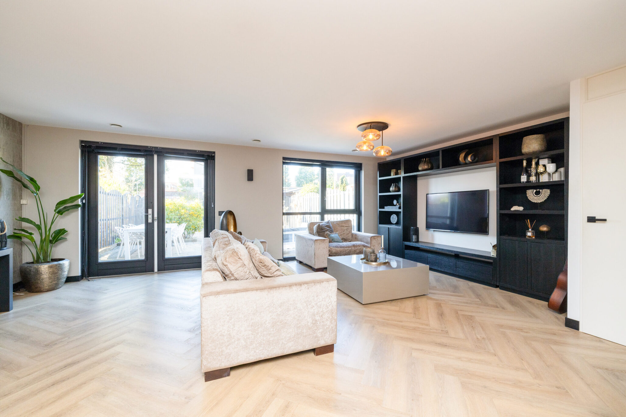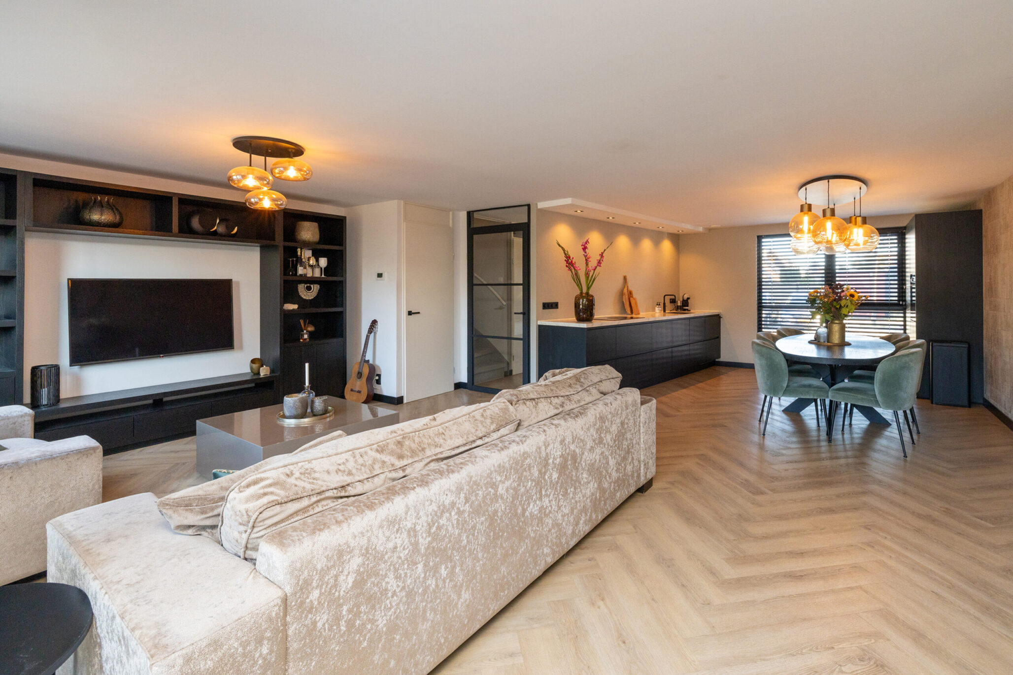 Via de ruime hal met garderobe, meterkast, modern hangend toilet, vaste kast en trapopgang bereik je de sfeervolle woonkamer. Een glazen deur geeft toegang tot de royale leefruimte van circa 50 m², waarbij de breedte van maar liefst 6,60 meter direct opvalt en zorgt voor een bijzonder ruimtelijk gevoel. De strakke wanden, het gestuukte plafond en de stijlvolle pvc-visgraatvloer met comfortabele vloerverwarming geven de parterre een warme en luxe uitstraling.