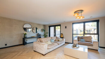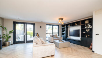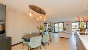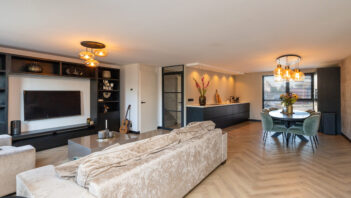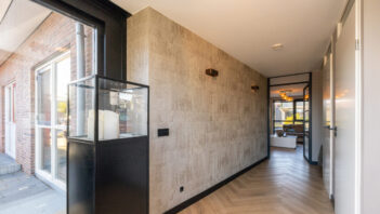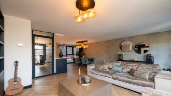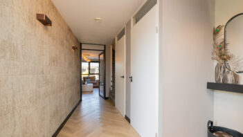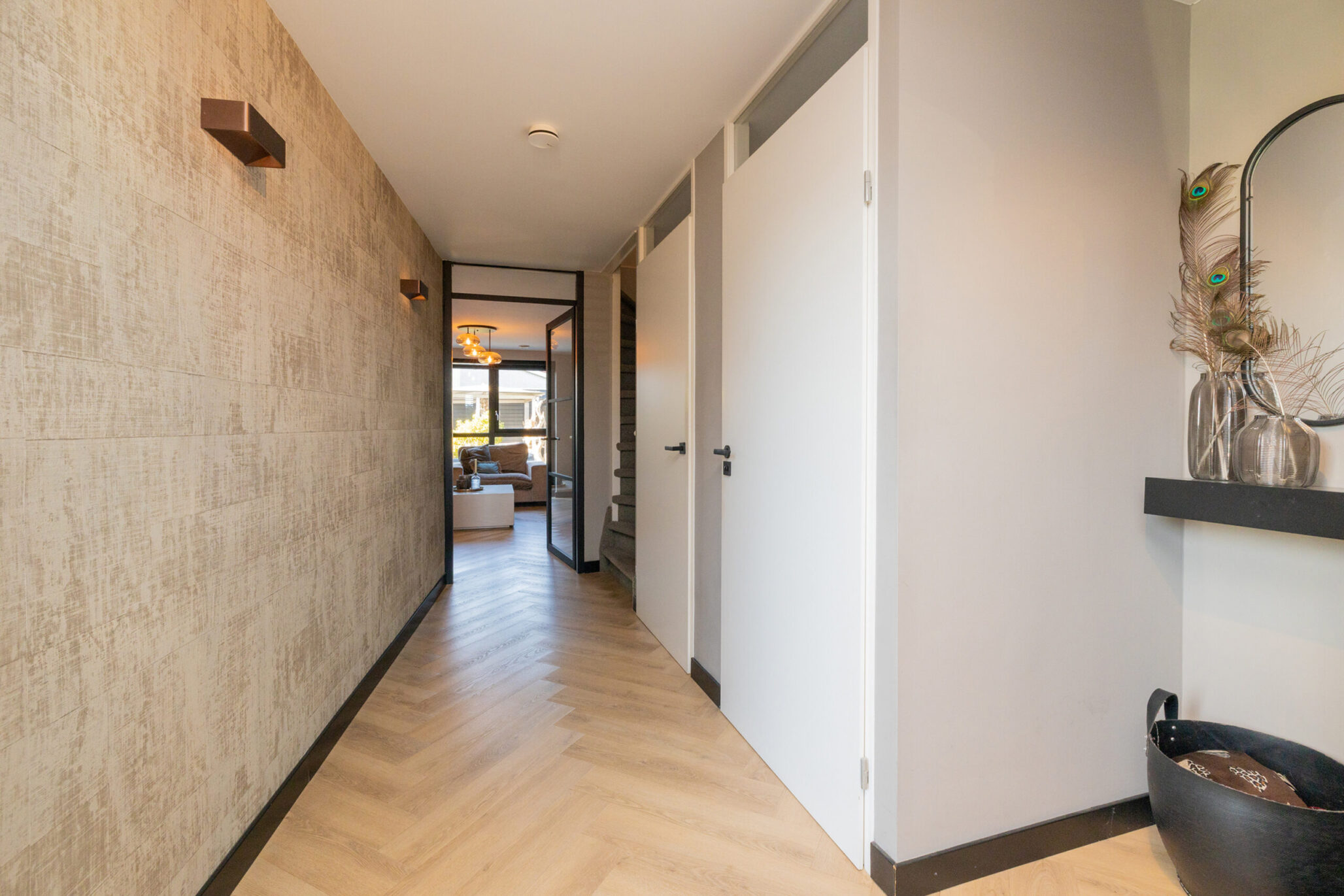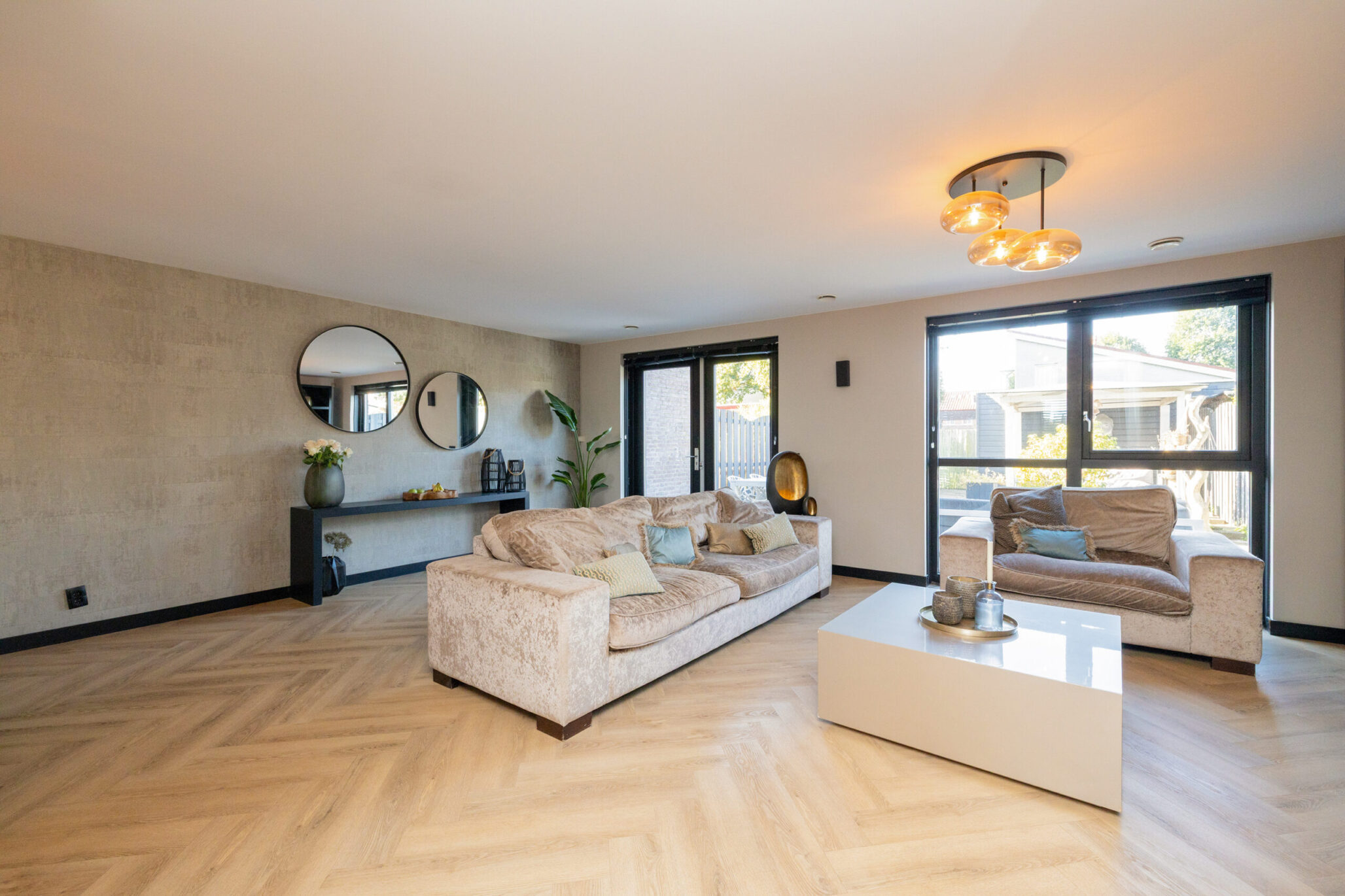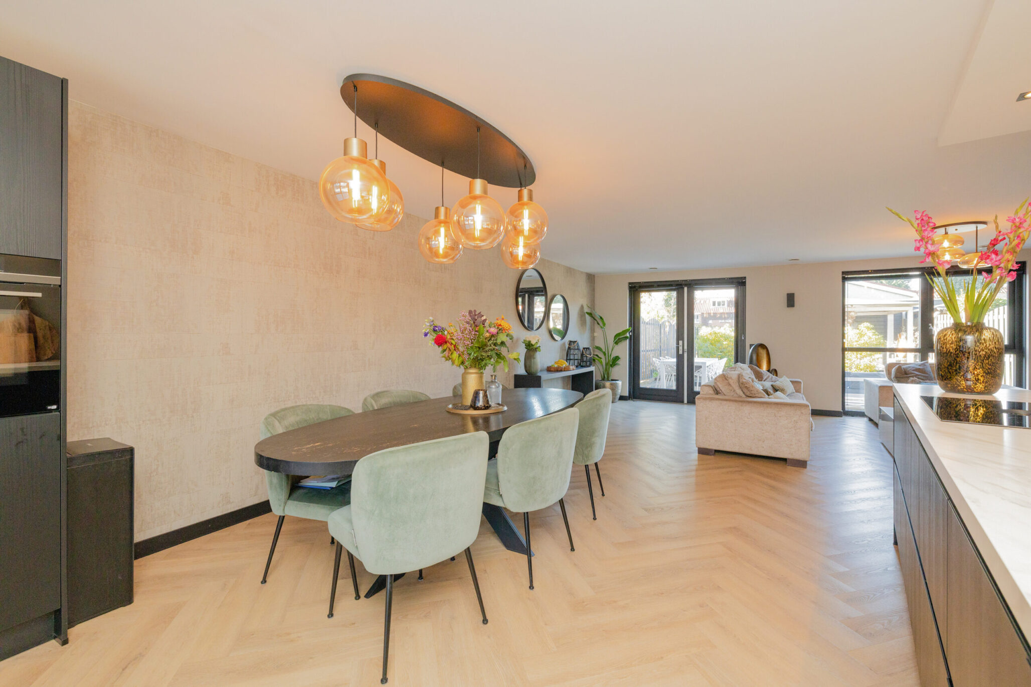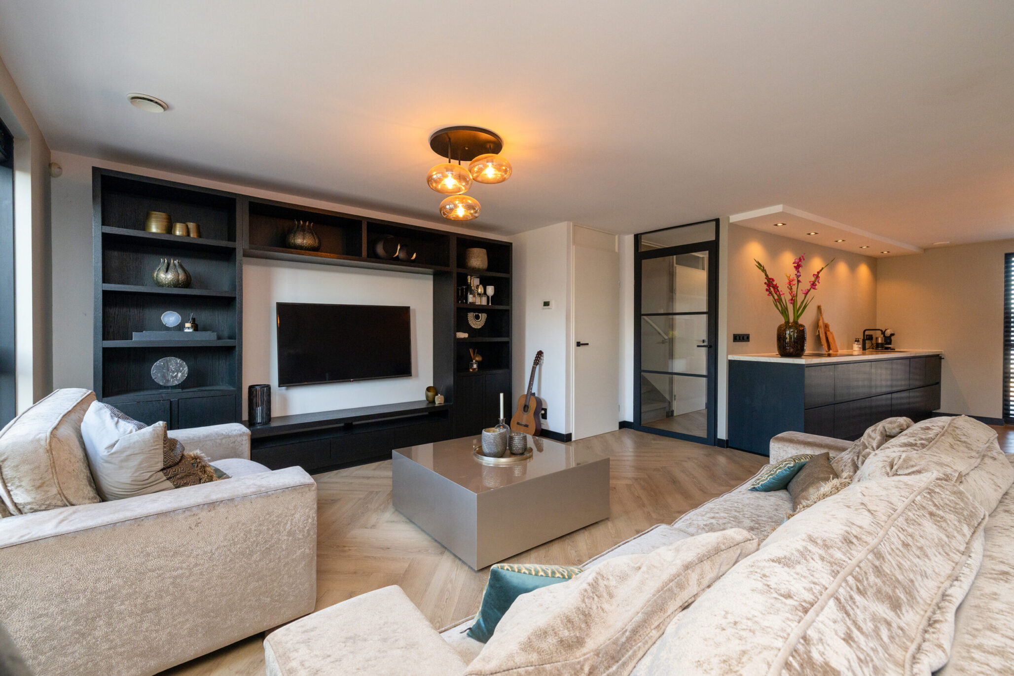 Via de ruime hal met garderobe, meterkast, modern hangend toilet, vaste kast en trapopgang bereik je de sfeervolle woonkamer. Een glazen deur geeft toegang tot de royale leefruimte van circa 50 m², waarbij de breedte van maar liefst 6,60 meter direct opvalt en zorgt voor een bijzonder ruimtelijk gevoel. De strakke wanden, het gestuukte plafond en de stijlvolle pvc-visgraatvloer met comfortabele vloerverwarming geven de parterre een warme en luxe uitstraling.