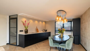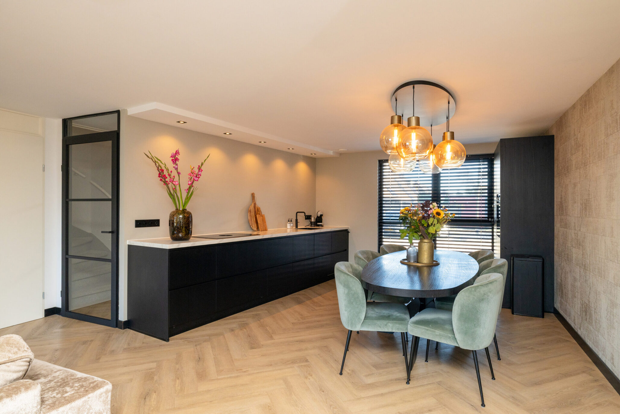 De eigentijdse zwarte woonkeuken met marmerlook werkblad is volledig uitgevoerd in de stijl van nu en voorzien van hoogwaardige inbouwapparatuur zoals een Quooker, inductiekookplaat met geïntegreerde afzuiging, combi-oven, vaatwasser en koel-vriescombinatie.