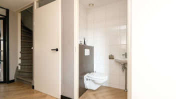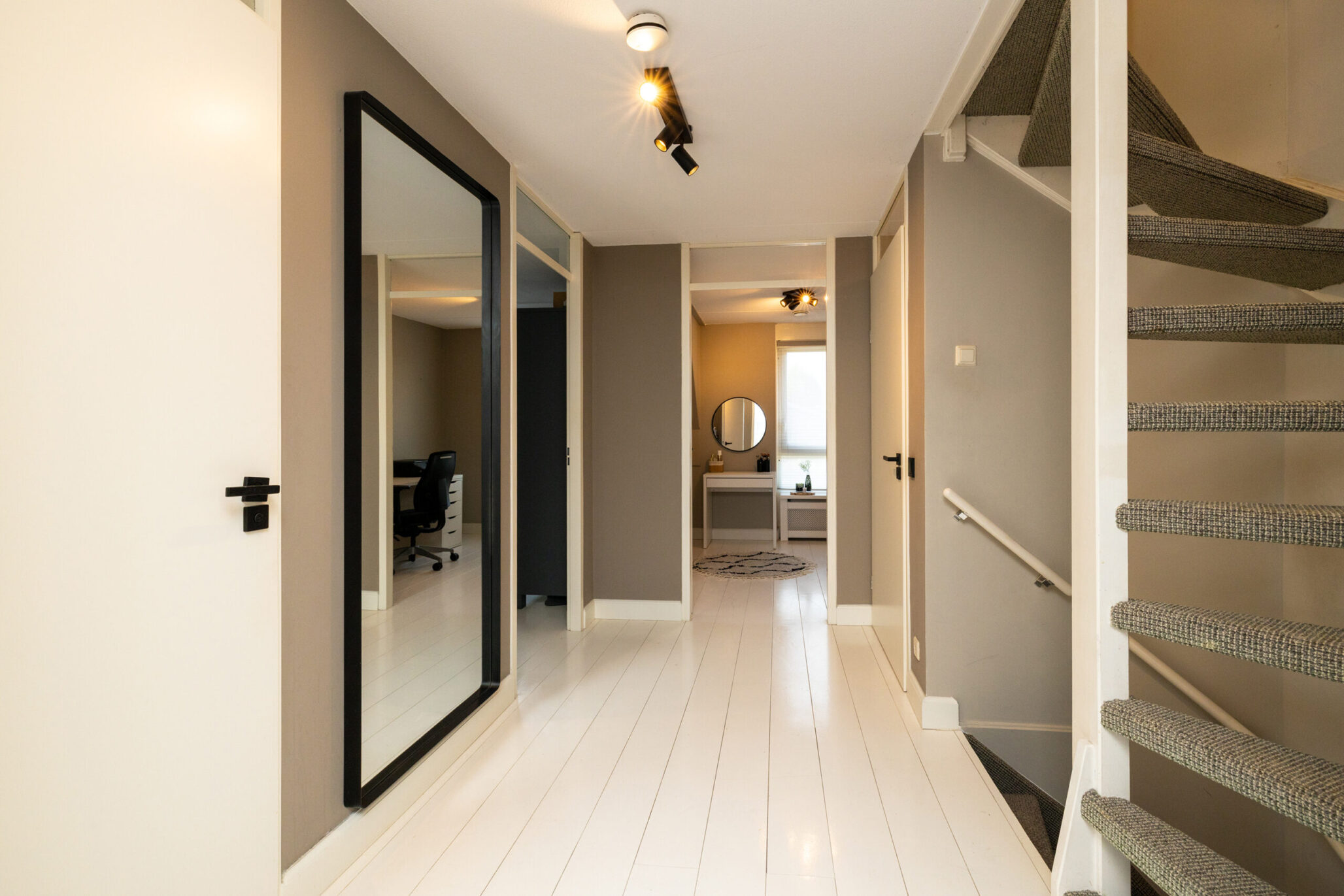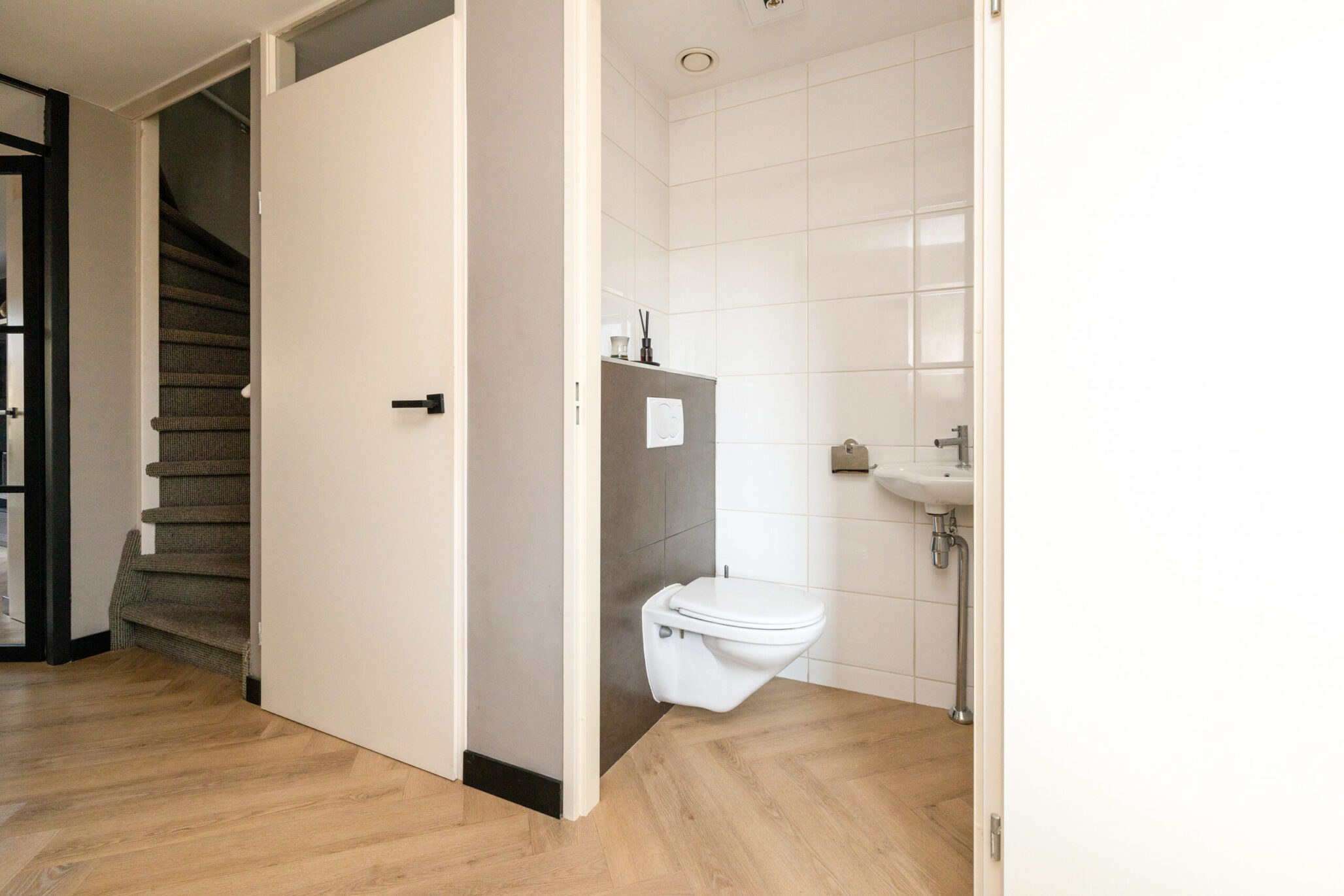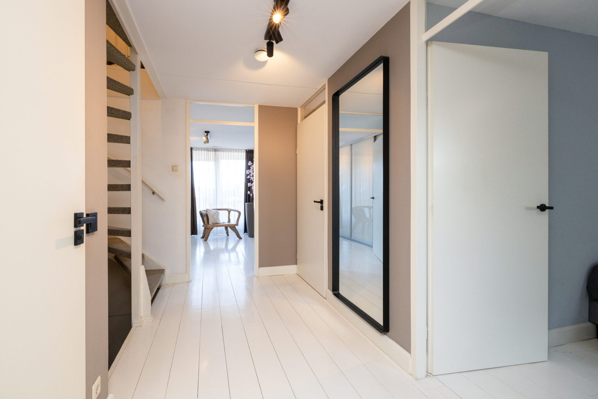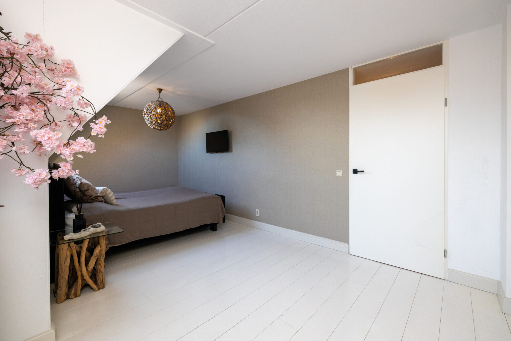 Op de eerste verdieping geeft de overloop toegang tot een modern tweede toilet en drie slaapkamers. De royale slaapkamer van ca. 21 m2 aan de voorzijde is gelegen over de gehele breedte van de woning en voorzien van een vaste kastenwand. De slaapkamers aan de achterzijde meten circa 13 m² en 7 m². De badkamer is in 2021 vernieuwd en straalt hotelkwaliteit uit, met een inloopdouche met rainshower en drainegoot, ligbad, dubbel wastafelmeubel en een strak gestuukt plafond met spots.