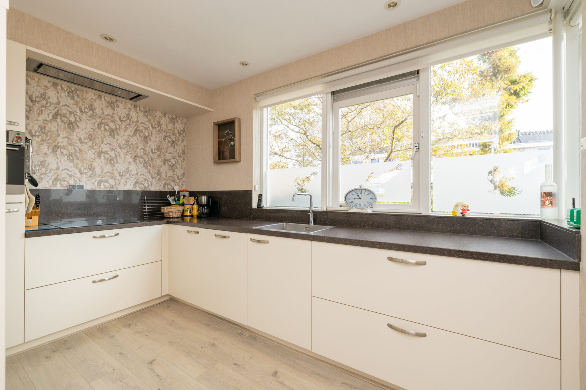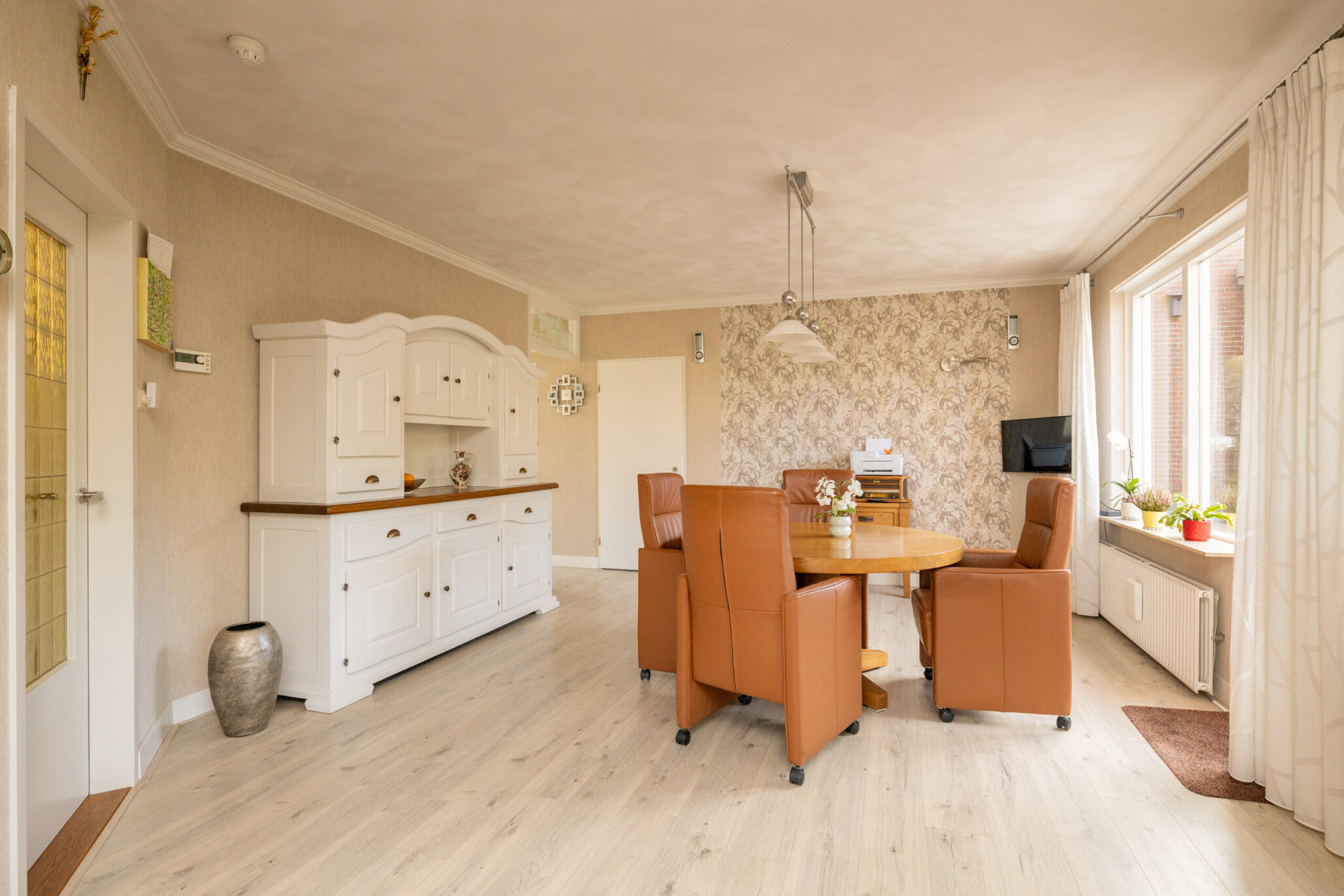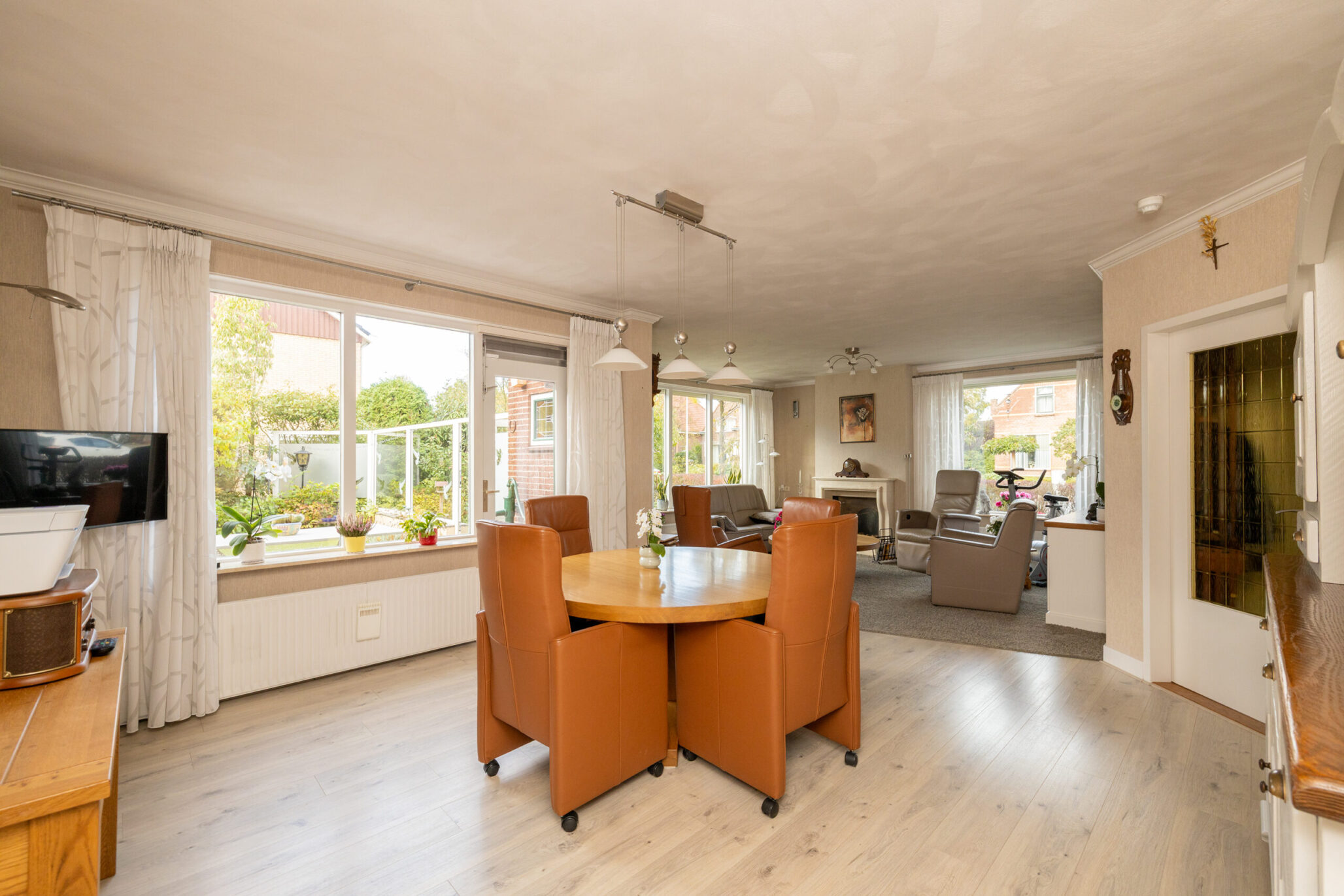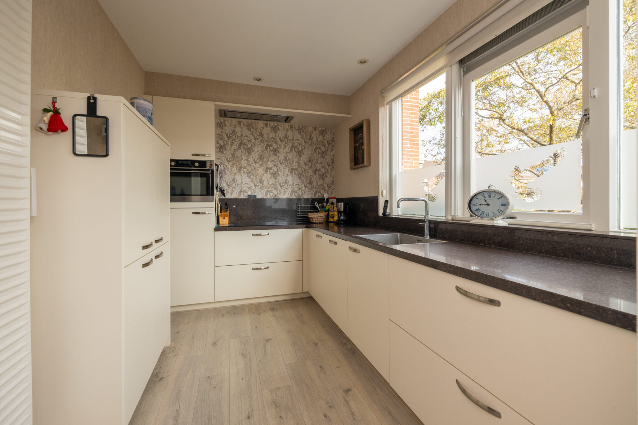 Aan de zijde van de Kerkstraat bevindt zich de lichte woonkamer met een gezellige open haard — een heerlijke plek om te ontspannen. Aan de andere zijde ligt de eetkamer, grenzend aan de half-open keuken in L-opstelling. De keuken is voorzien van diverse inbouwapparatuur, waaronder een vaatwasser, koelkast, vriezer, combi-oven, inductie kookplaat met afzuigkap en een spoelbak met mengkraan. Dankzij de prettige lichtinval en de inbouwspots is het hier aangenaam koken.