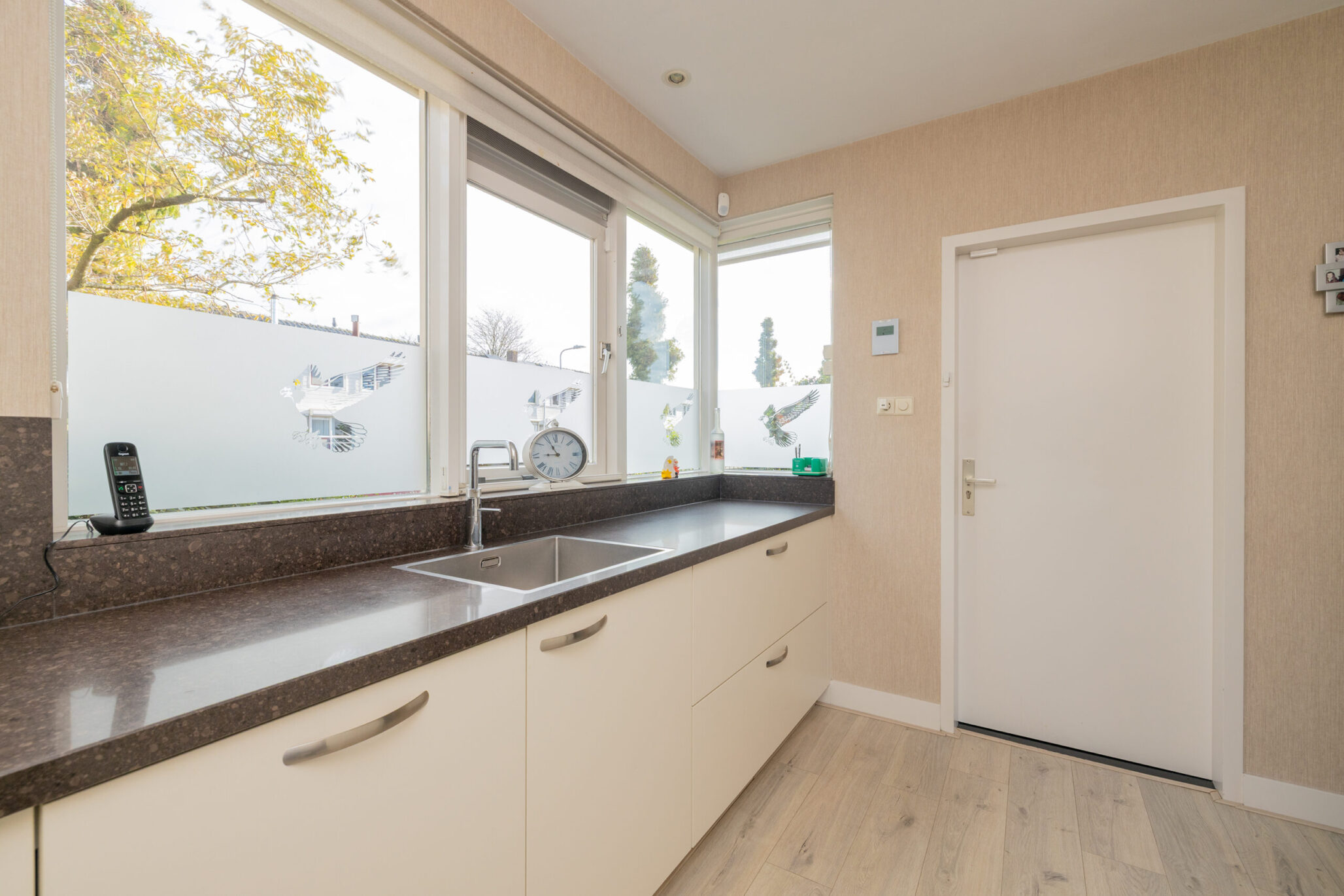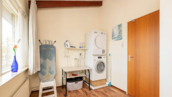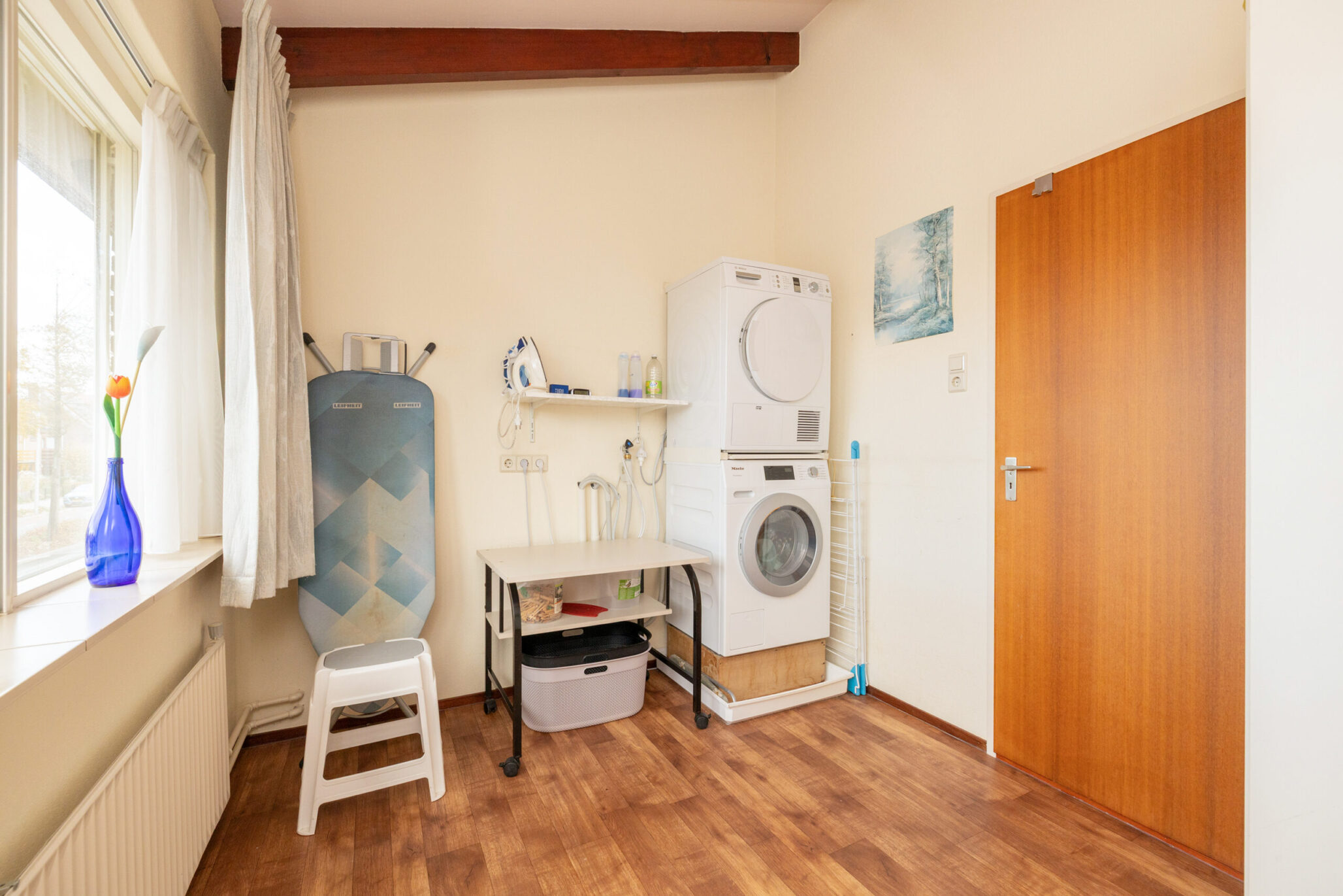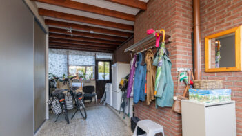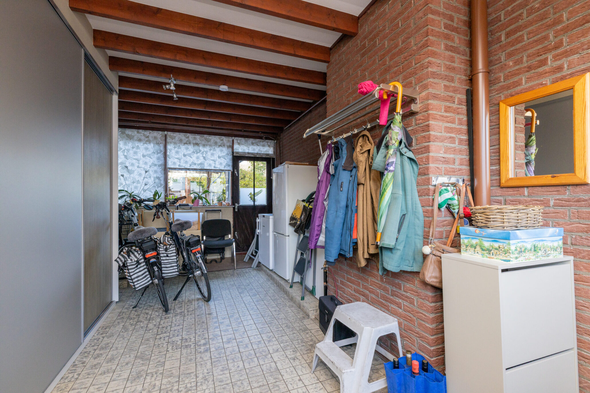 Vanuit de keuken is er toegang tot de berging, die zowel van binnenuit als van buiten (aan voor- en achterzijde) bereikbaar is. Deze ruimte wordt momenteel gebruikt als bijkeuken/schuur en is voorzien van een kastenwand voor extra bergruimte en plek voor fietsen. De houten balken in het plafond geven het geheel een karakteristieke uitstraling.