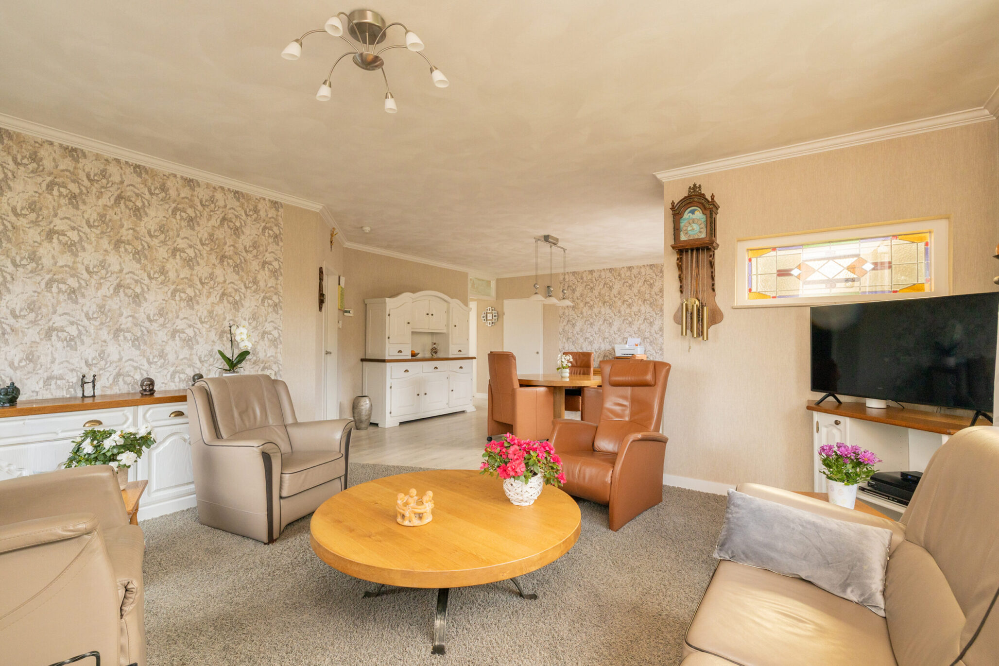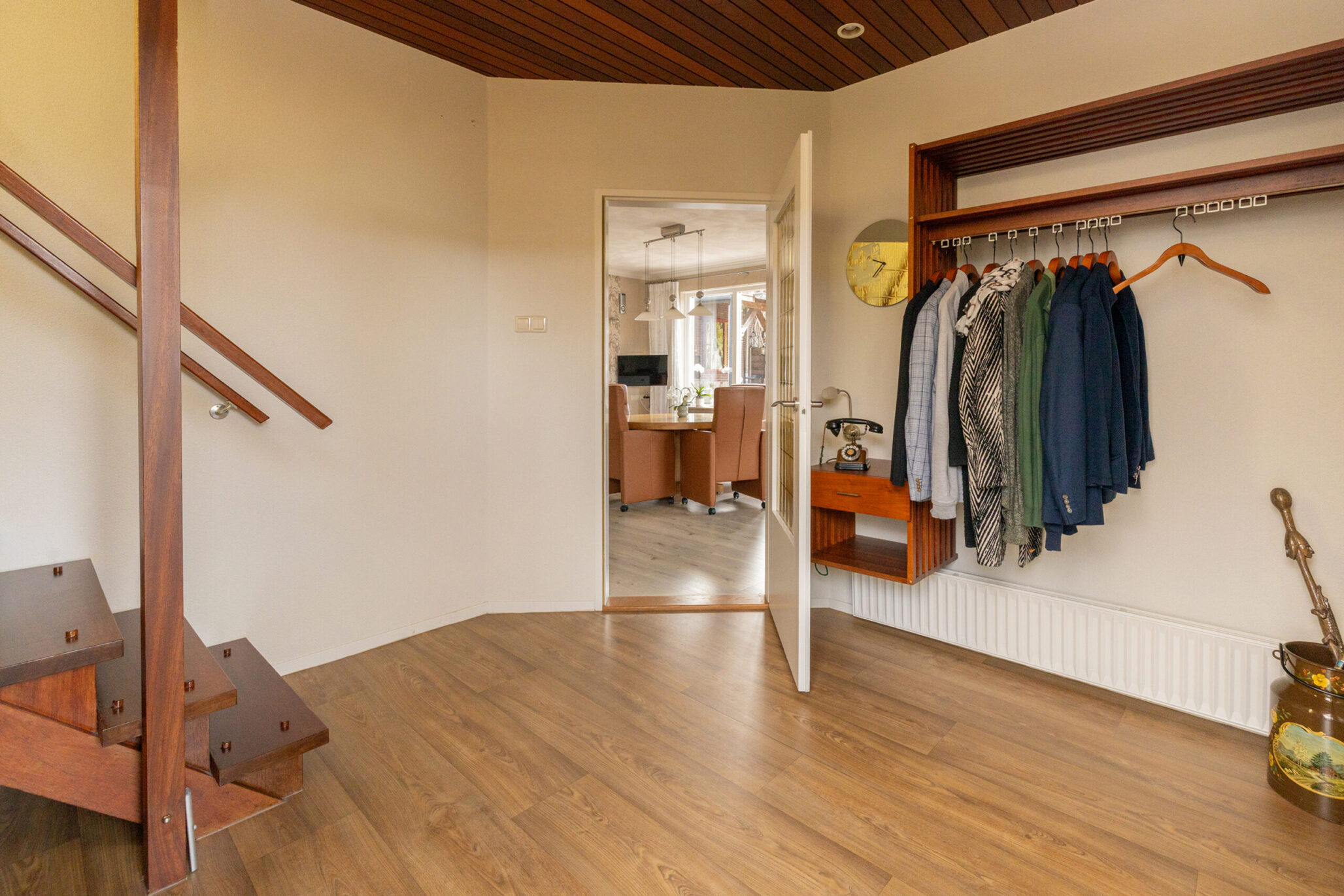 Via de overdekte voordeur kom je binnen in de ruime hal met plek voor de garderobe, een licht betegeld toilet met fonteintje, trapopgang naar boven met verdiepte kelderkast en toegang tot de woonkamer met eetgedeelte en half-open keuken.