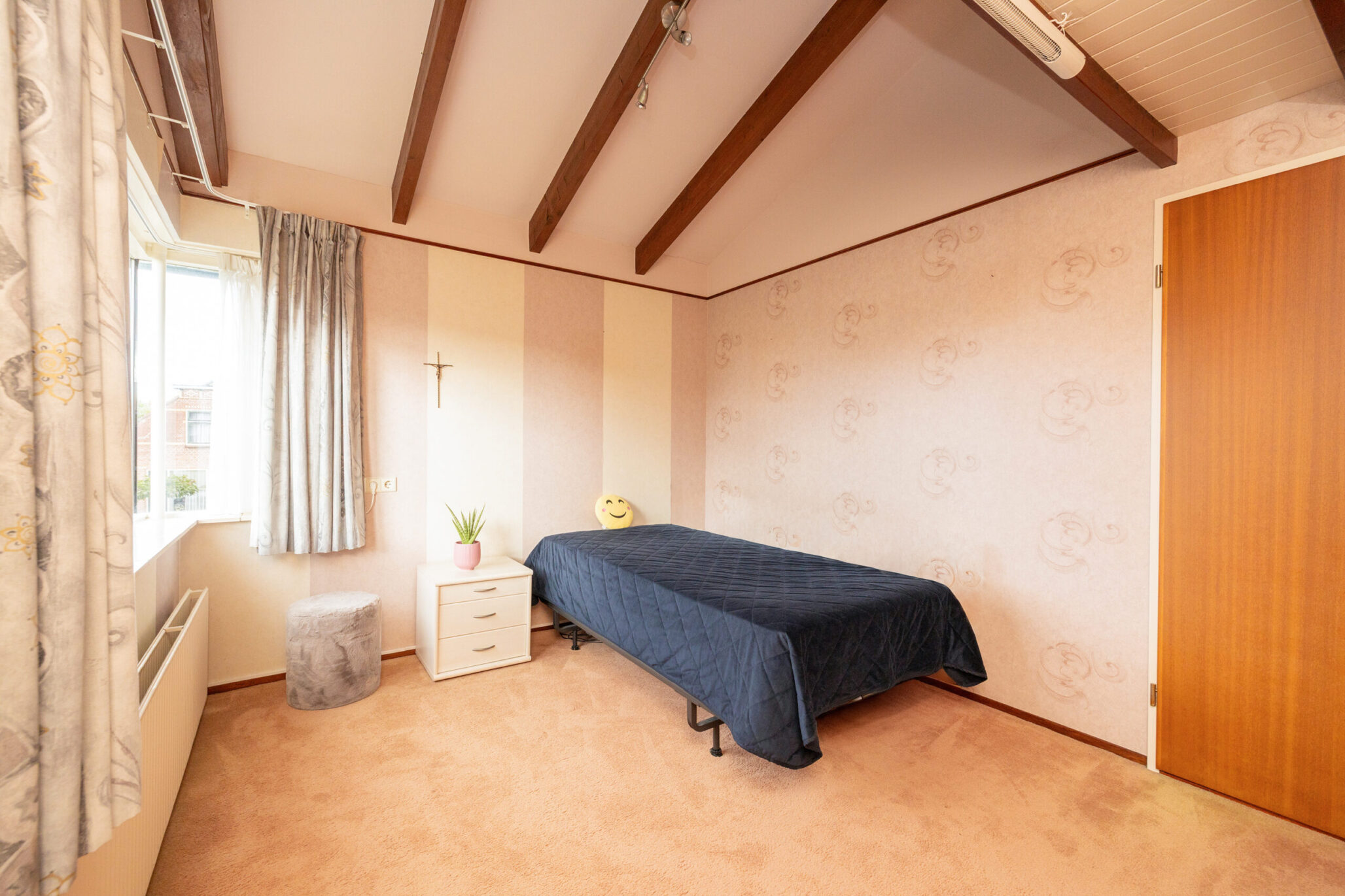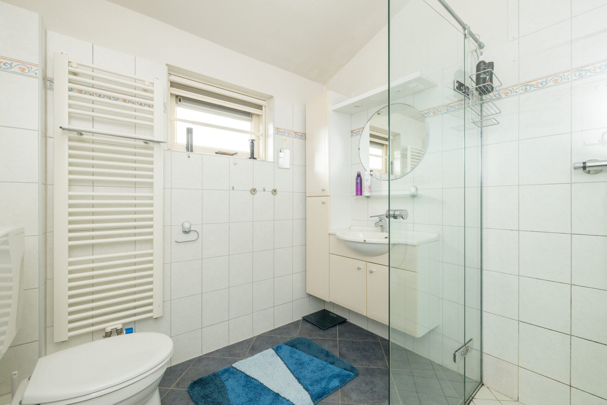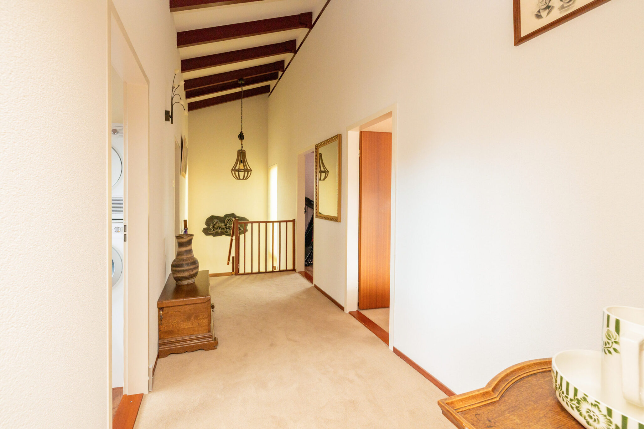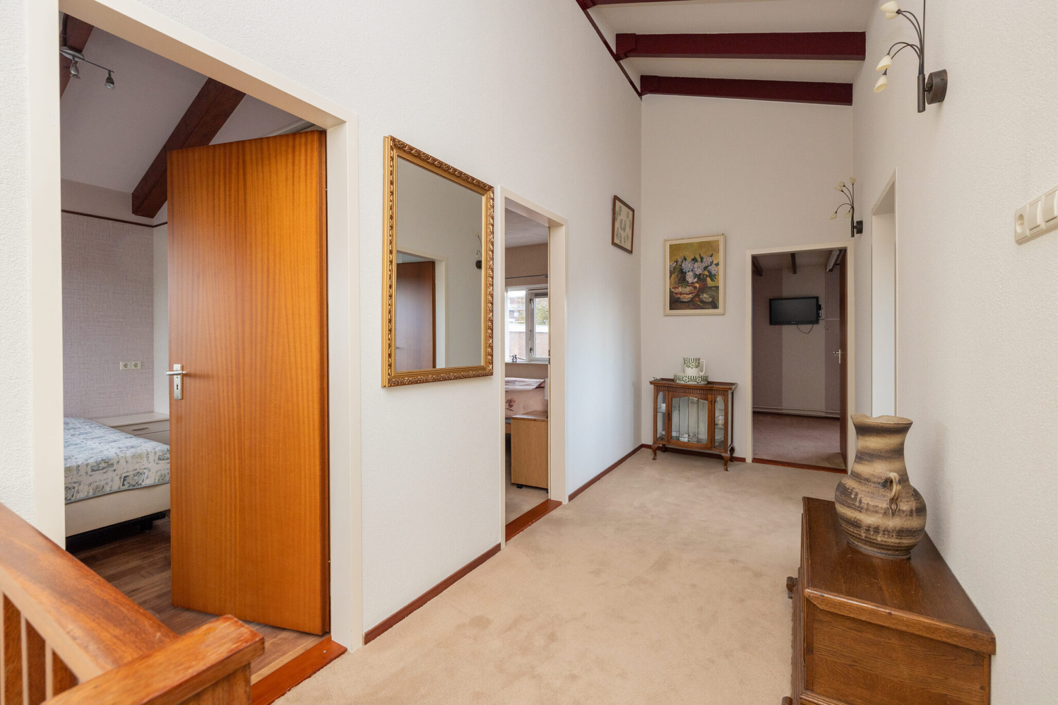 De open trap in de hal leidt naar de ruime overloop van de eerste verdieping. Hier valt direct het hoge plafond op met houten balken die ook in de slaapkamers terugkomen, wat zorgt voor een warme sfeer. Vanaf de overloop zijn alle vertrekken bereikbaar: een volledig betegelde badkamer met inloopdouche, wastafelmeubel en tweede toilet, drie slaapkamers (van ca. 10, 13 en 16 m²) en een aparte waskamer (ca. 8 m²) met aansluitingen voor de wasmachine en droger. Eén van de slaapkamers beschikt over airconditioning (2025) en geeft toegang tot het royale dakterras van ca. 19 m² — een heerlijke plek om van de zon te genieten. Een andere slaapkamer heeft een praktische vide die extra bergruimte biedt.