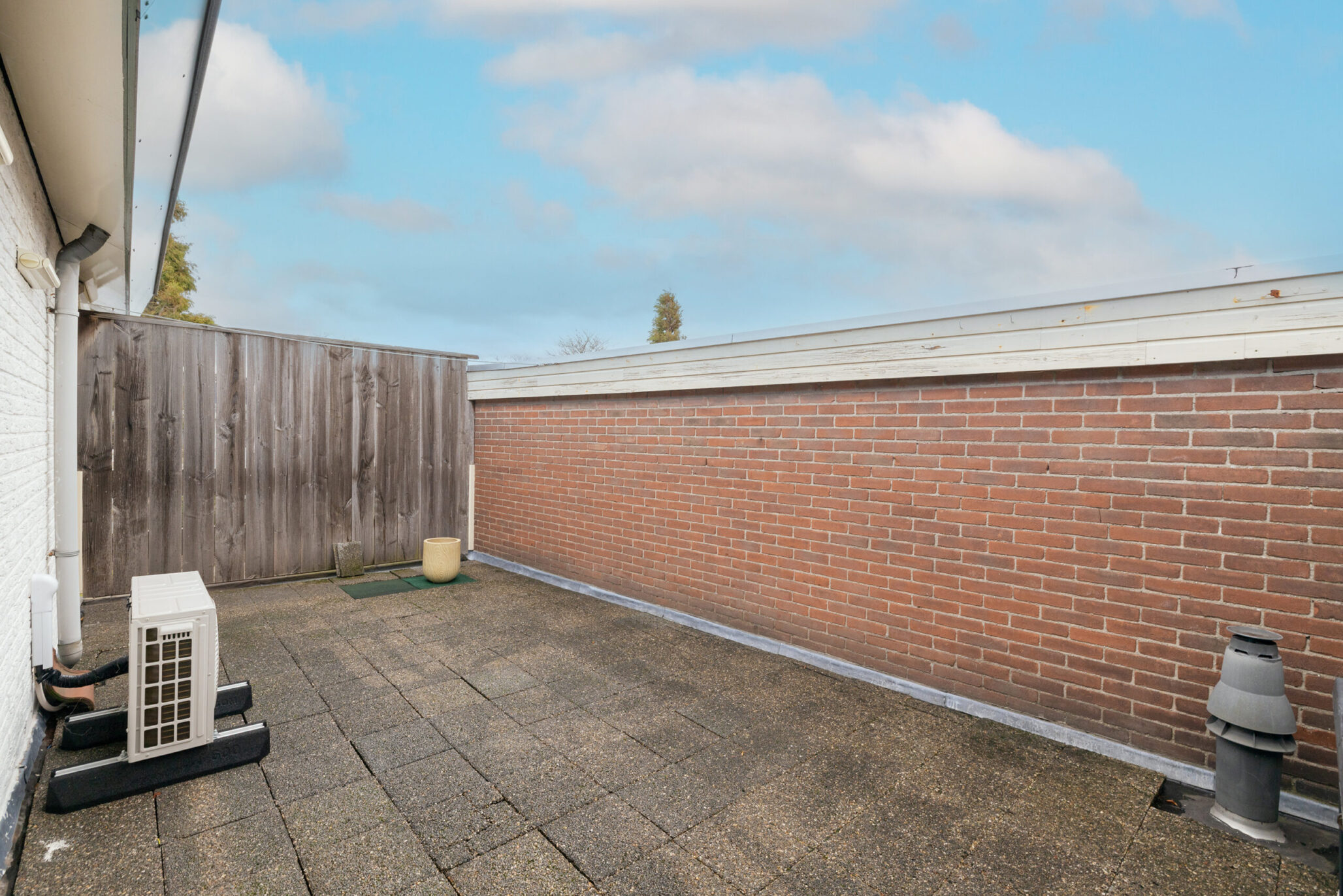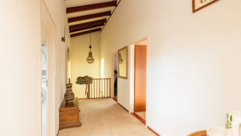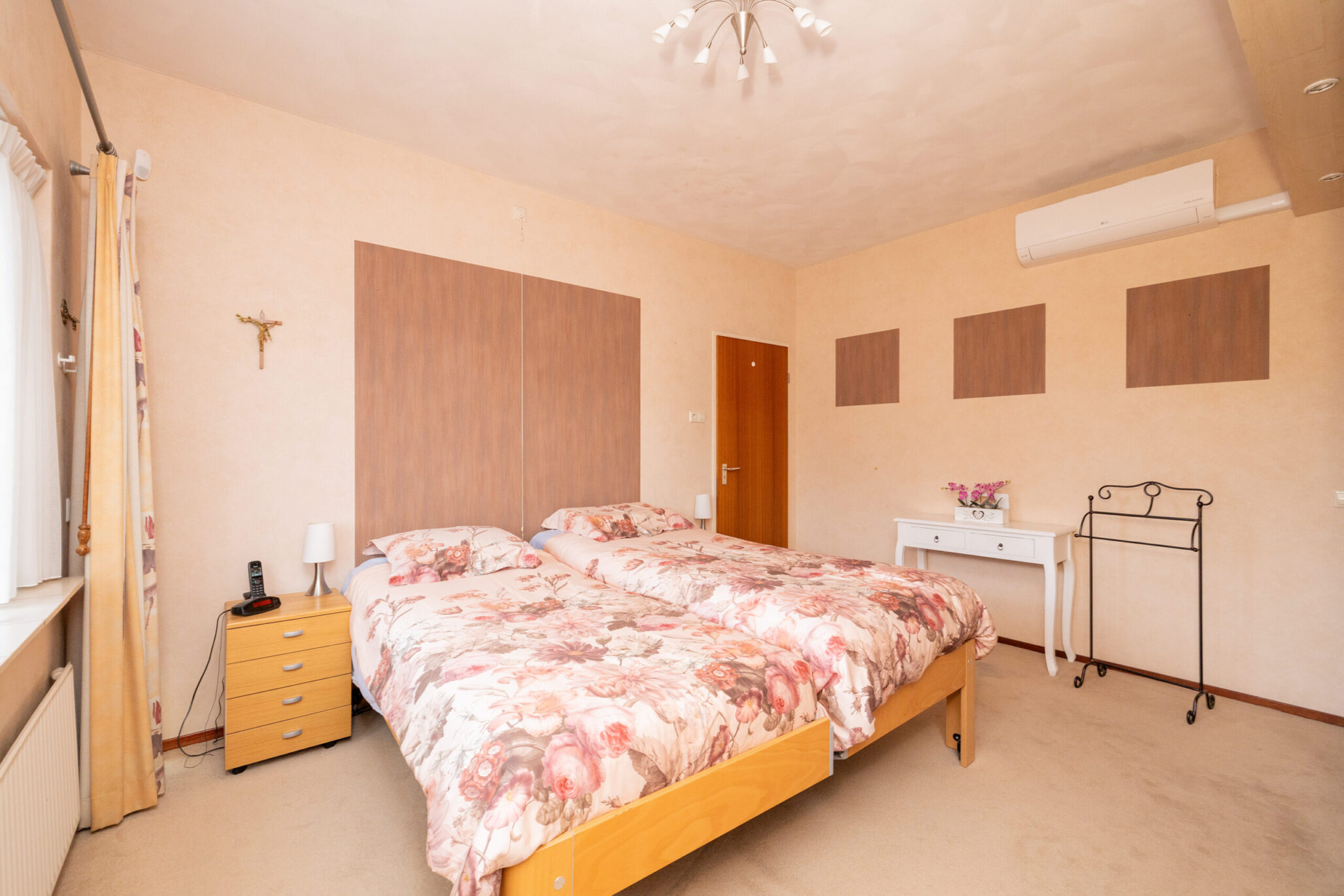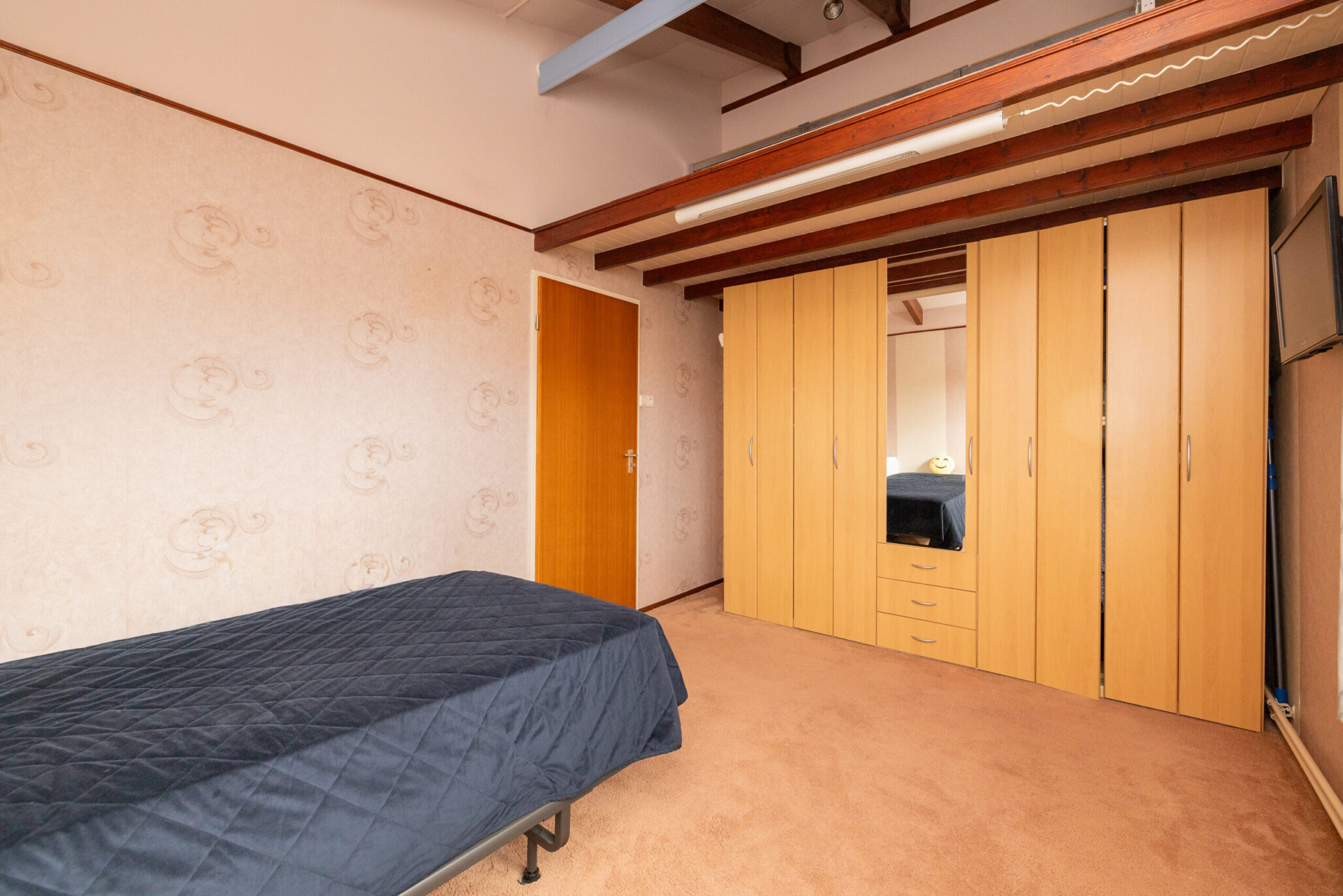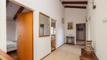 De open trap in de hal leidt naar de ruime overloop van de eerste verdieping. Hier valt direct het hoge plafond op met houten balken die ook in de slaapkamers terugkomen, wat zorgt voor een warme sfeer. Vanaf de overloop zijn alle vertrekken bereikbaar: een volledig betegelde badkamer met inloopdouche, wastafelmeubel en tweede toilet, drie slaapkamers (van ca. 10, 13 en 16 m²) en een aparte waskamer (ca. 8 m²) met aansluitingen voor de wasmachine en droger. Eén van de slaapkamers beschikt over airconditioning (2025) en geeft toegang tot het royale dakterras van ca. 19 m² — een heerlijke plek om van de zon te genieten. Een andere slaapkamer heeft een praktische vide die extra bergruimte biedt.
