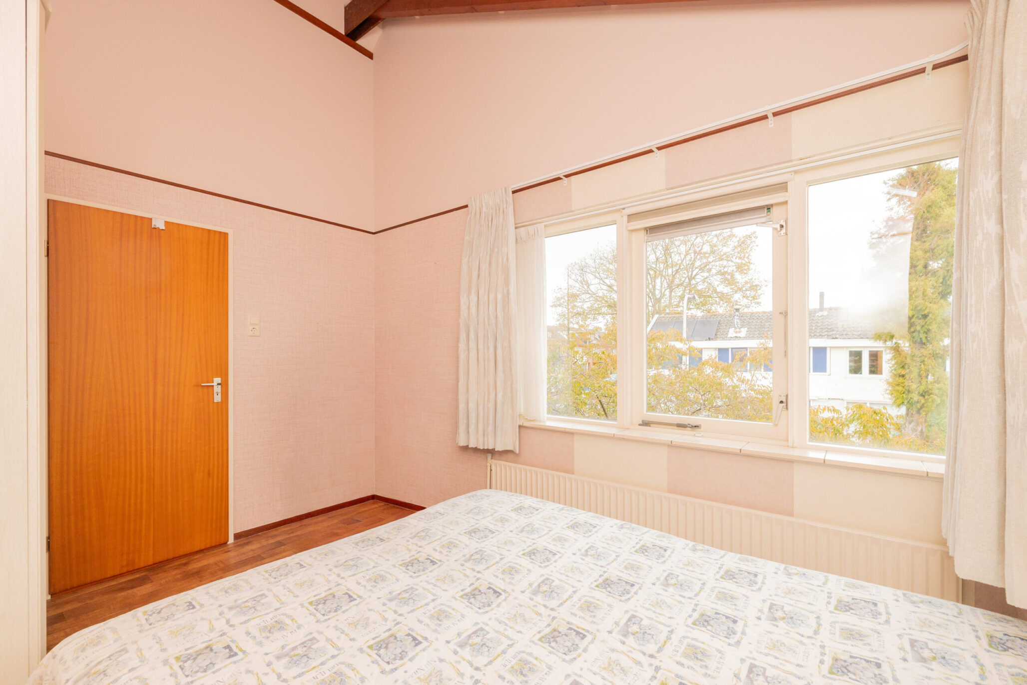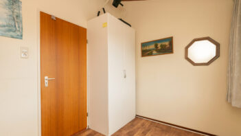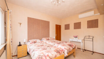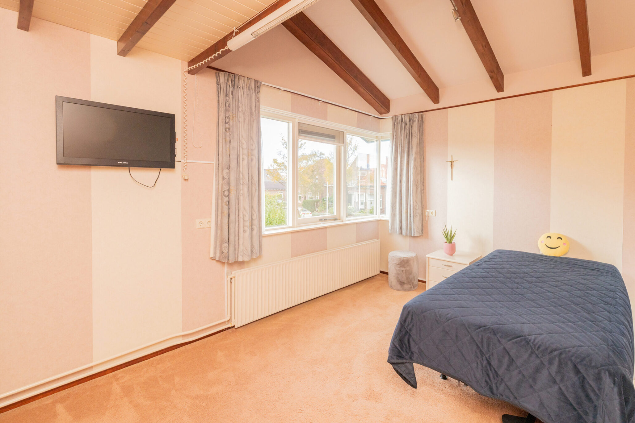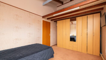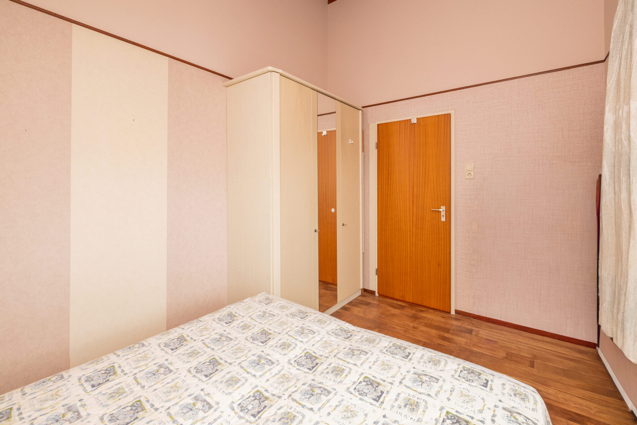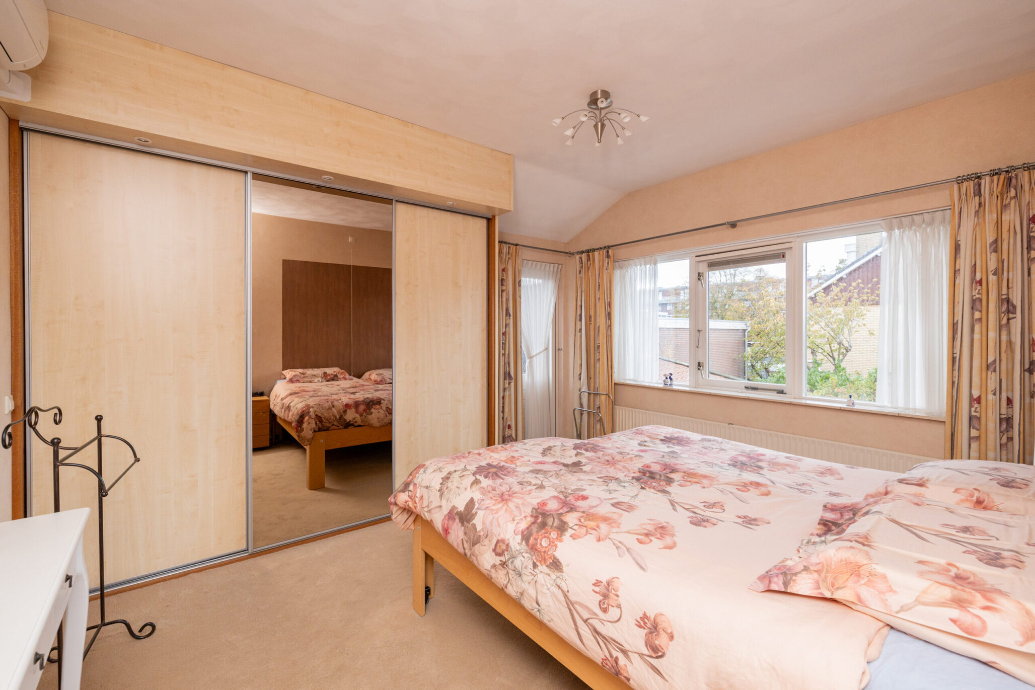 De open trap in de hal leidt naar de ruime overloop van de eerste verdieping. Hier valt direct het hoge plafond op met houten balken die ook in de slaapkamers terugkomen, wat zorgt voor een warme sfeer. Vanaf de overloop zijn alle vertrekken bereikbaar: een volledig betegelde badkamer met inloopdouche, wastafelmeubel en tweede toilet, drie slaapkamers (van ca. 10, 13 en 16 m²) en een aparte waskamer (ca. 8 m²) met aansluitingen voor de wasmachine en droger. Eén van de slaapkamers beschikt over airconditioning (2025) en geeft toegang tot het royale dakterras van ca. 19 m² — een heerlijke plek om van de zon te genieten. Een andere slaapkamer heeft een praktische vide die extra bergruimte biedt.