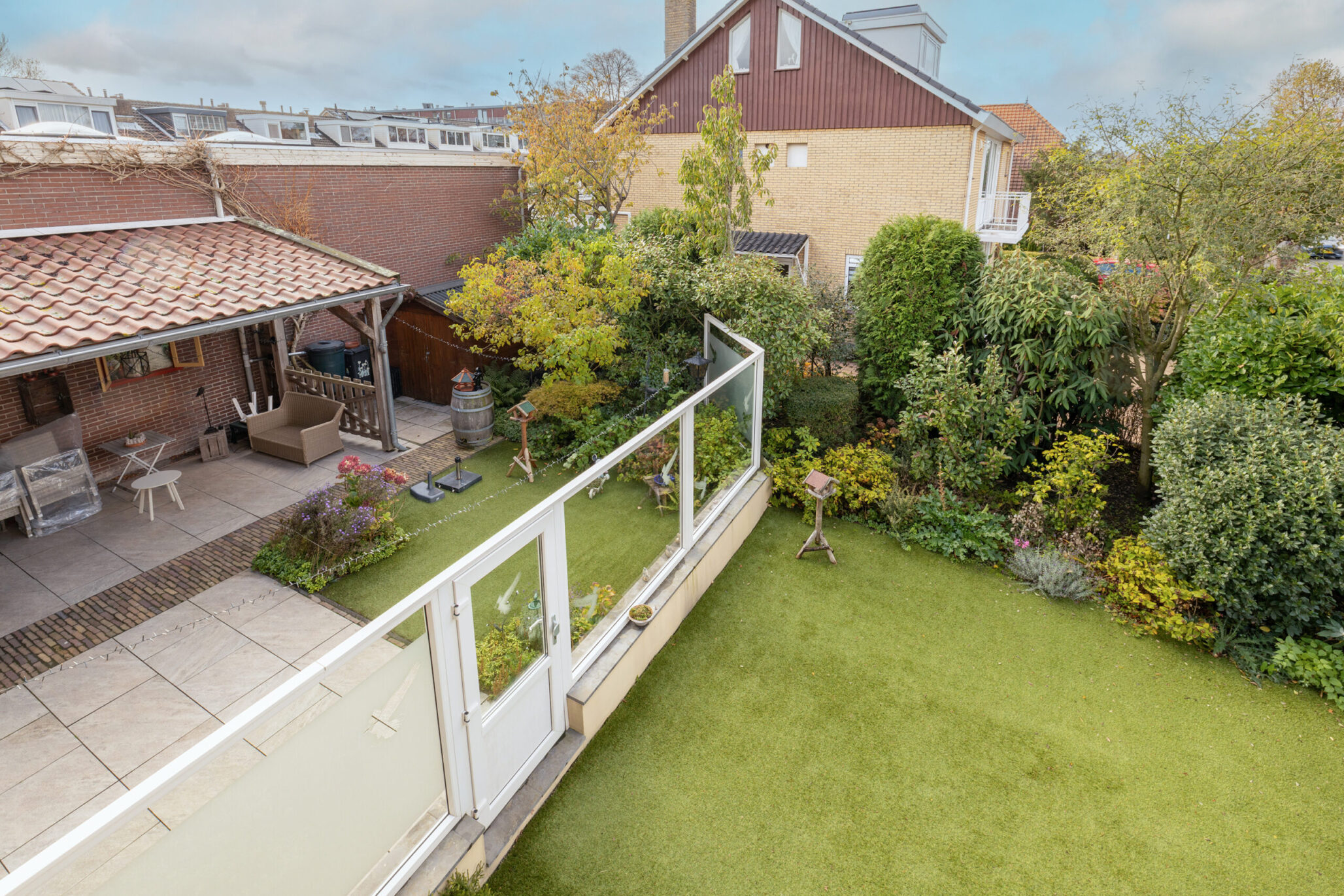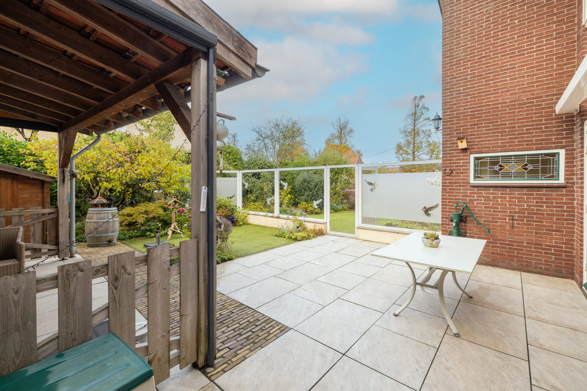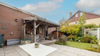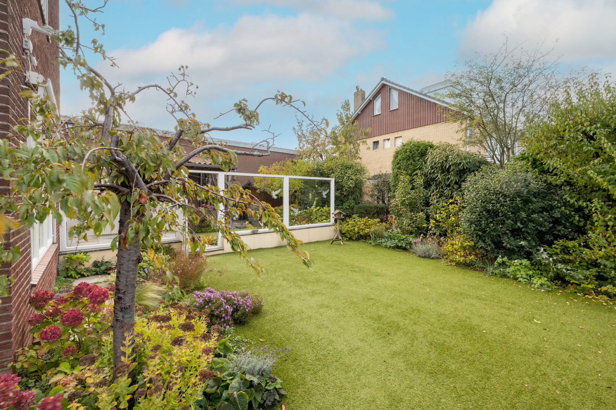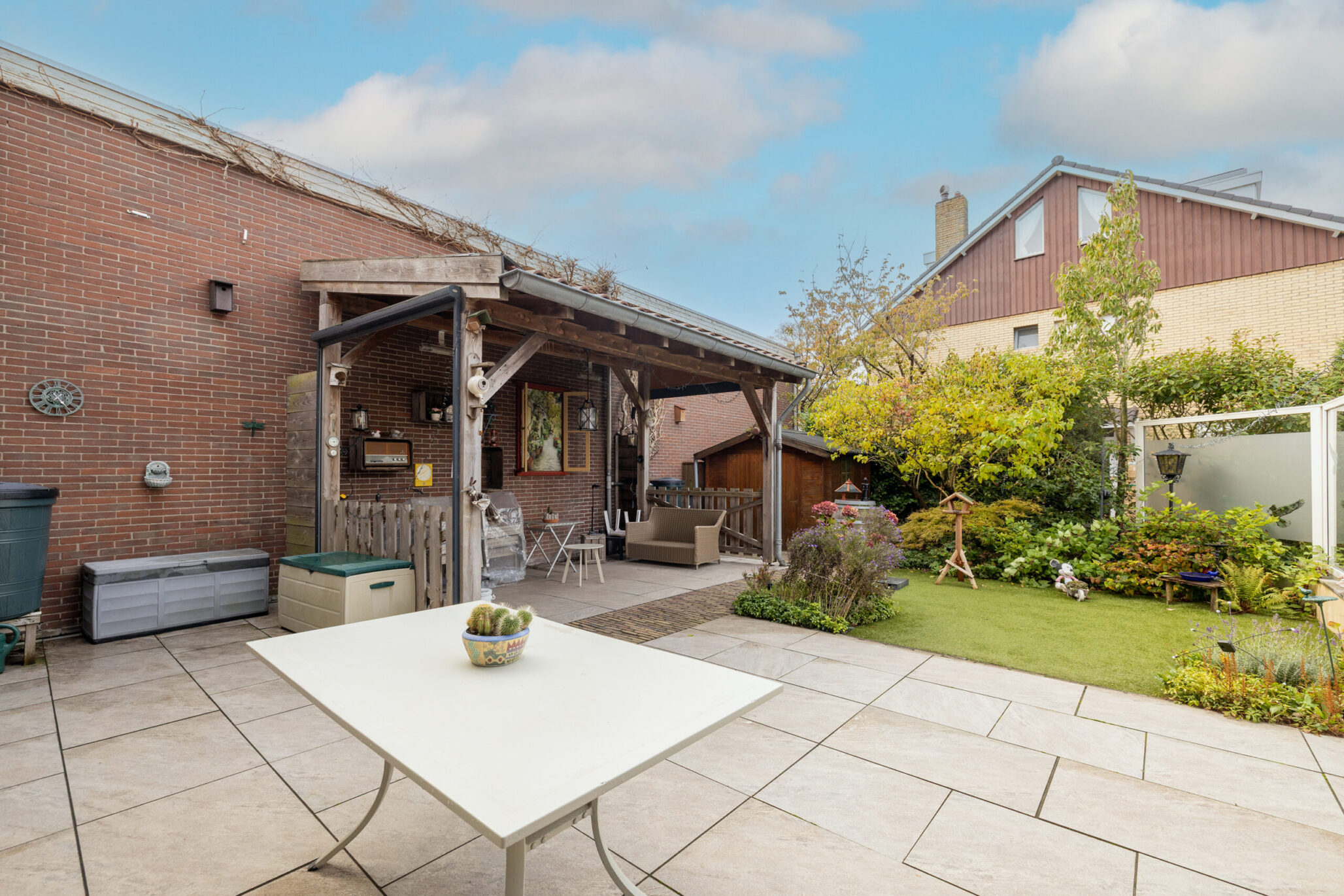 De achtertuin is bereikbaar via de berging en de eetkamer en is gelegen op het zonnige gedeelte van het perceel (zuidwesten). De tuin is opgedeeld door een glazen wand: aan de ene zijde een betegeld terras met overkapping en vrijstaande houten berging, aan de andere zijde een groen gazon dat doorloopt naar de voortuin — perfect voor zowel ontspanning als buitenactiviteiten.