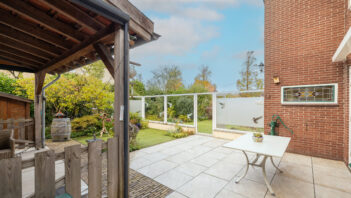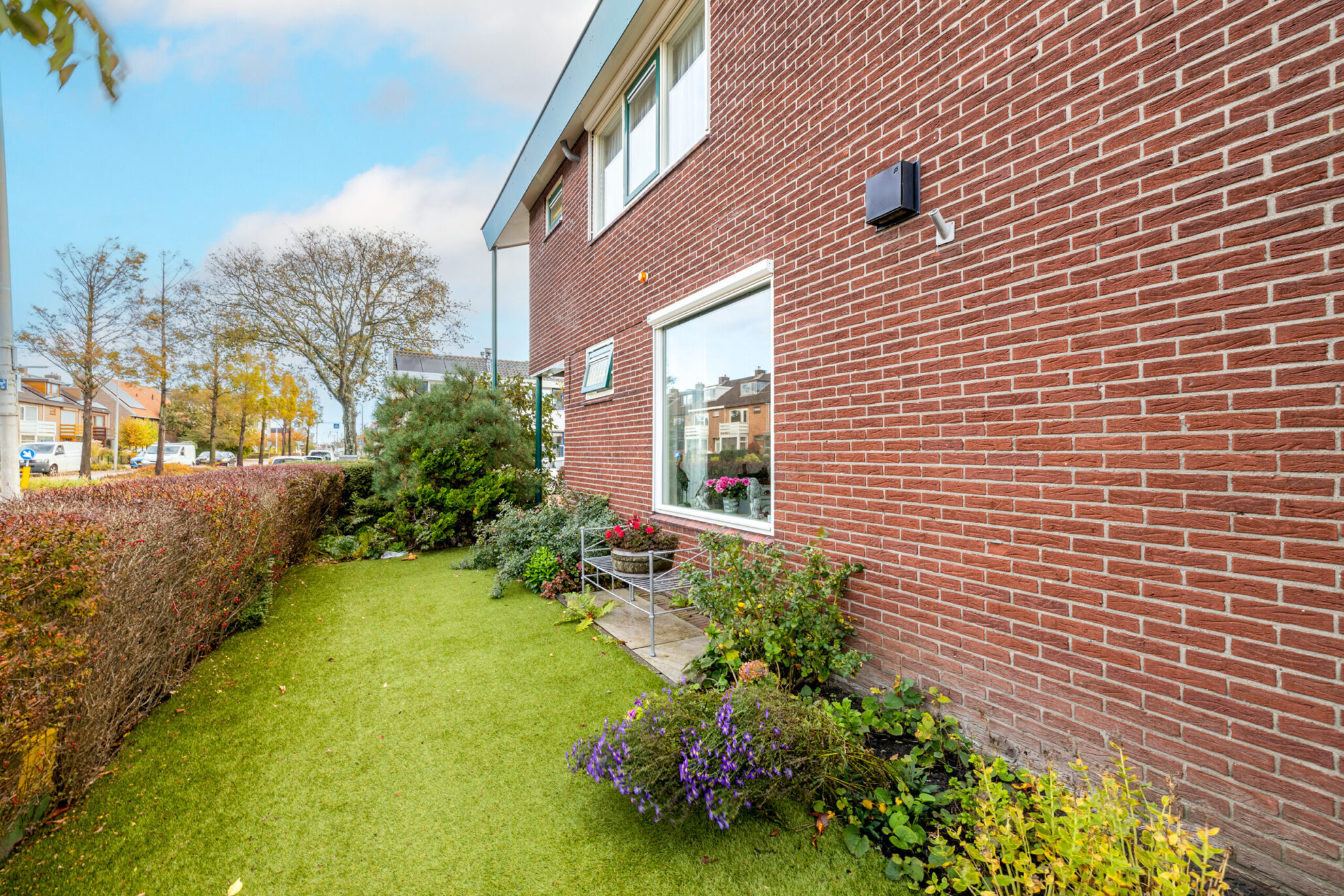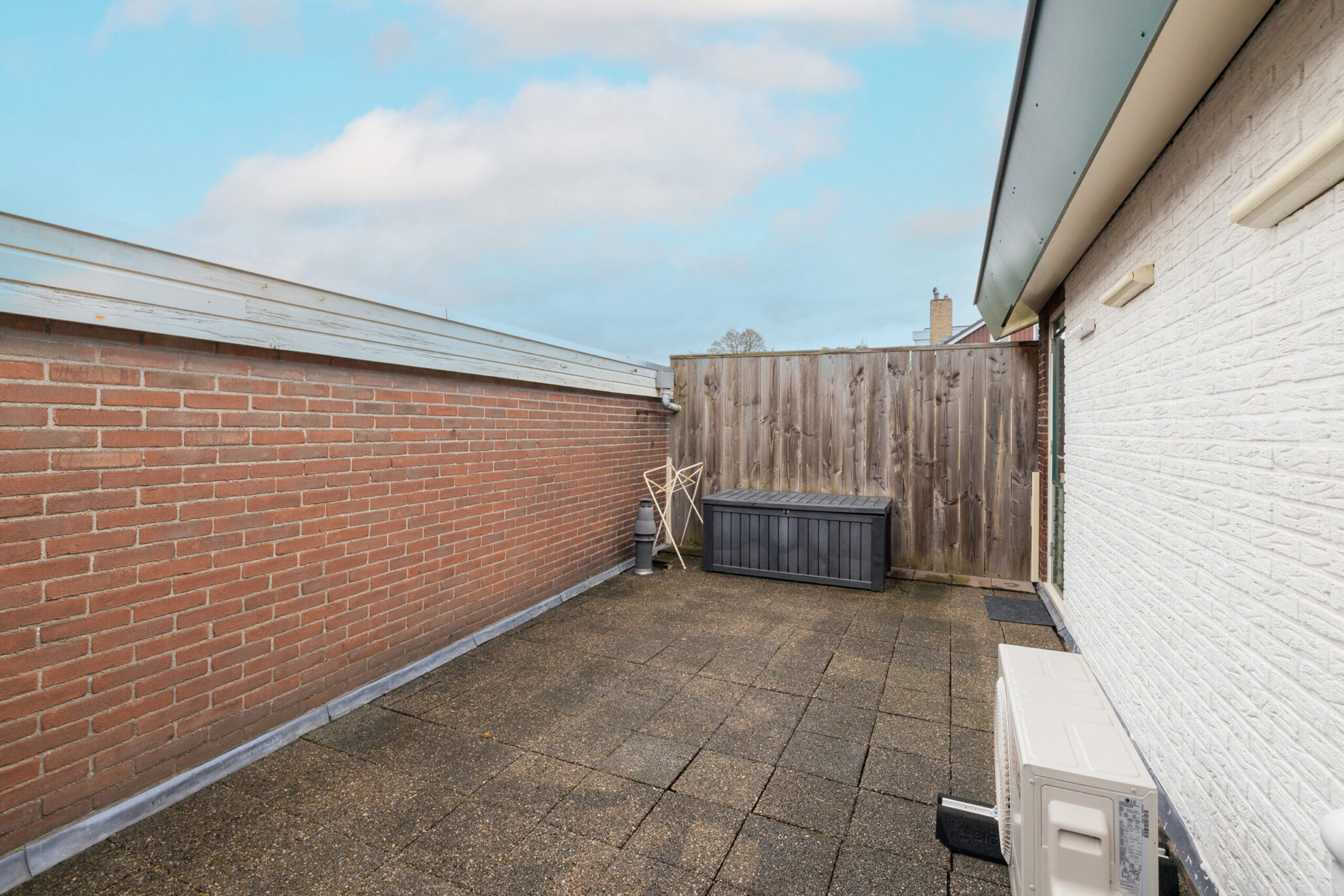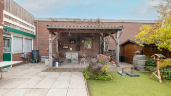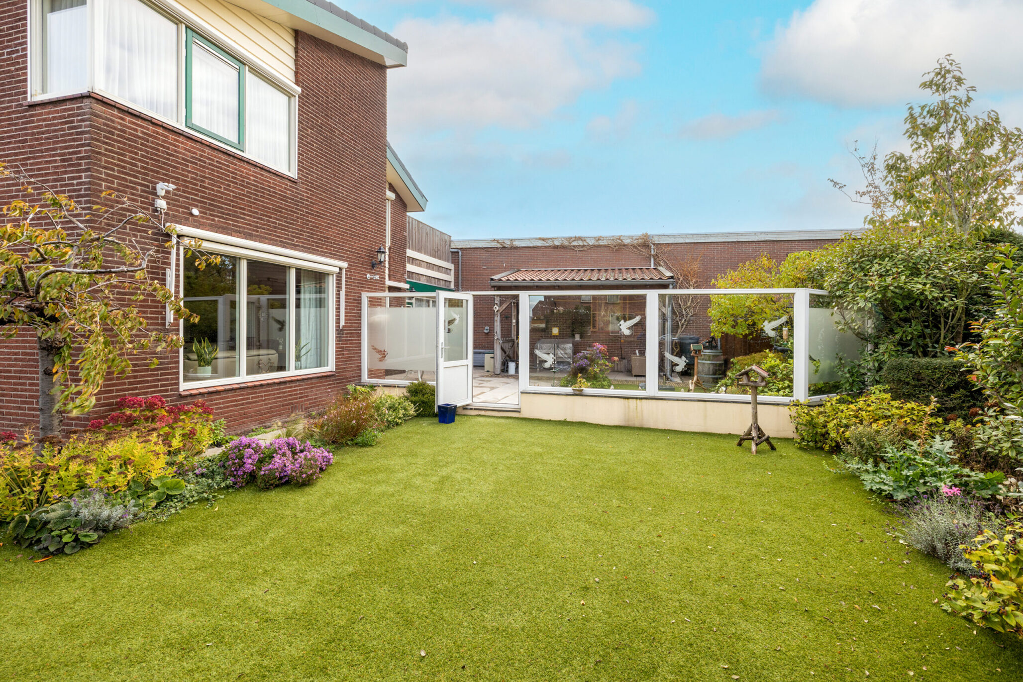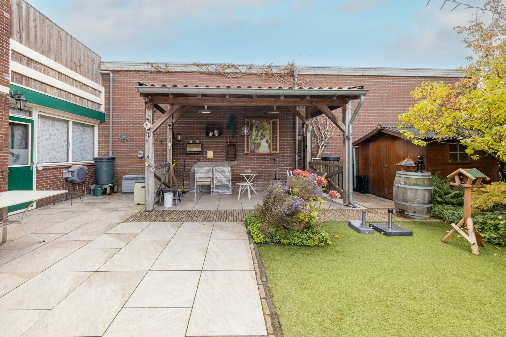De achtertuin is bereikbaar via de berging en de eetkamer en is gelegen op het zonnige gedeelte van het perceel (zuidwesten). De tuin is opgedeeld door een glazen wand: aan de ene zijde een betegeld terras met overkapping en vrijstaande houten berging, aan de andere zijde een groen gazon dat doorloopt naar de voortuin — perfect voor zowel ontspanning als buitenactiviteiten.