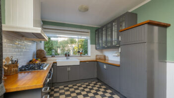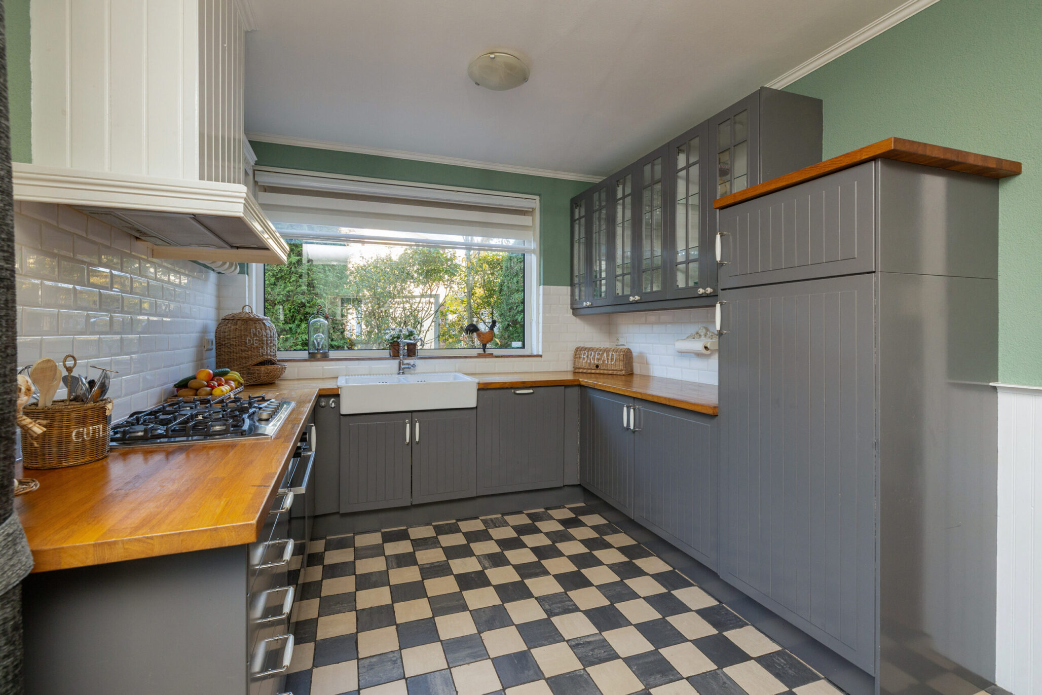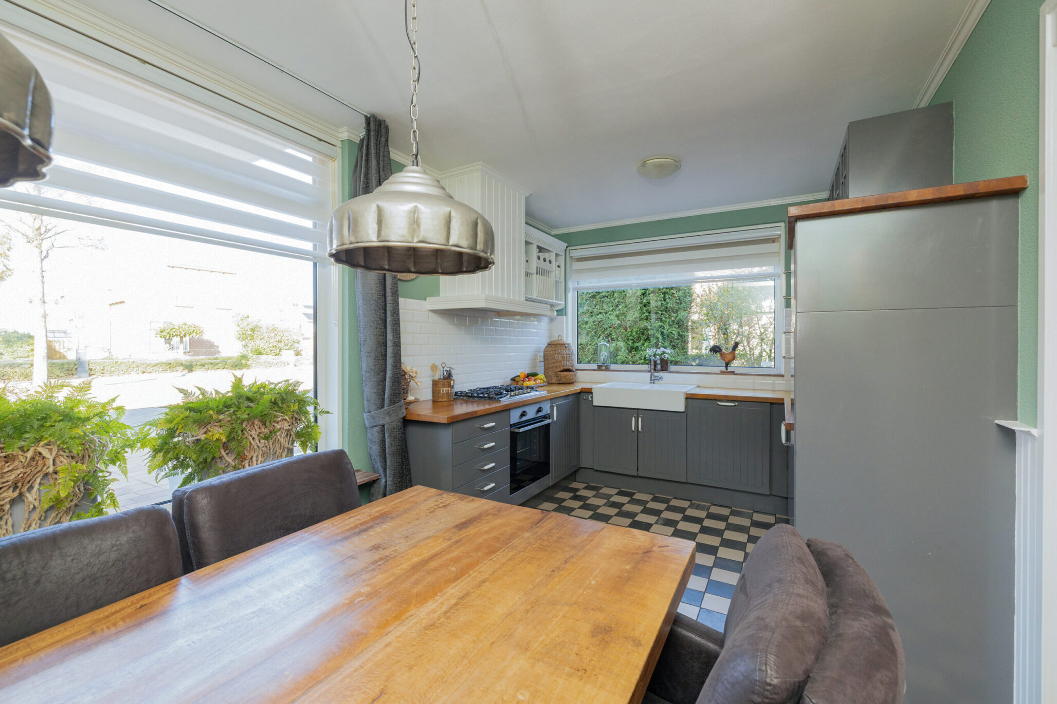 Aan de voorzijde bevindt zich de gezellige half-open keuken in U-opstelling, voorzien van een bruin werkblad en grijze kastfronten. De keuken beschikt over diverse inbouwapparatuur, waaronder een 5-pits gaskookplaat met afzuigkap, combi-oven, koelkast, vriezer en dubbele spoelbak met mengkraan.