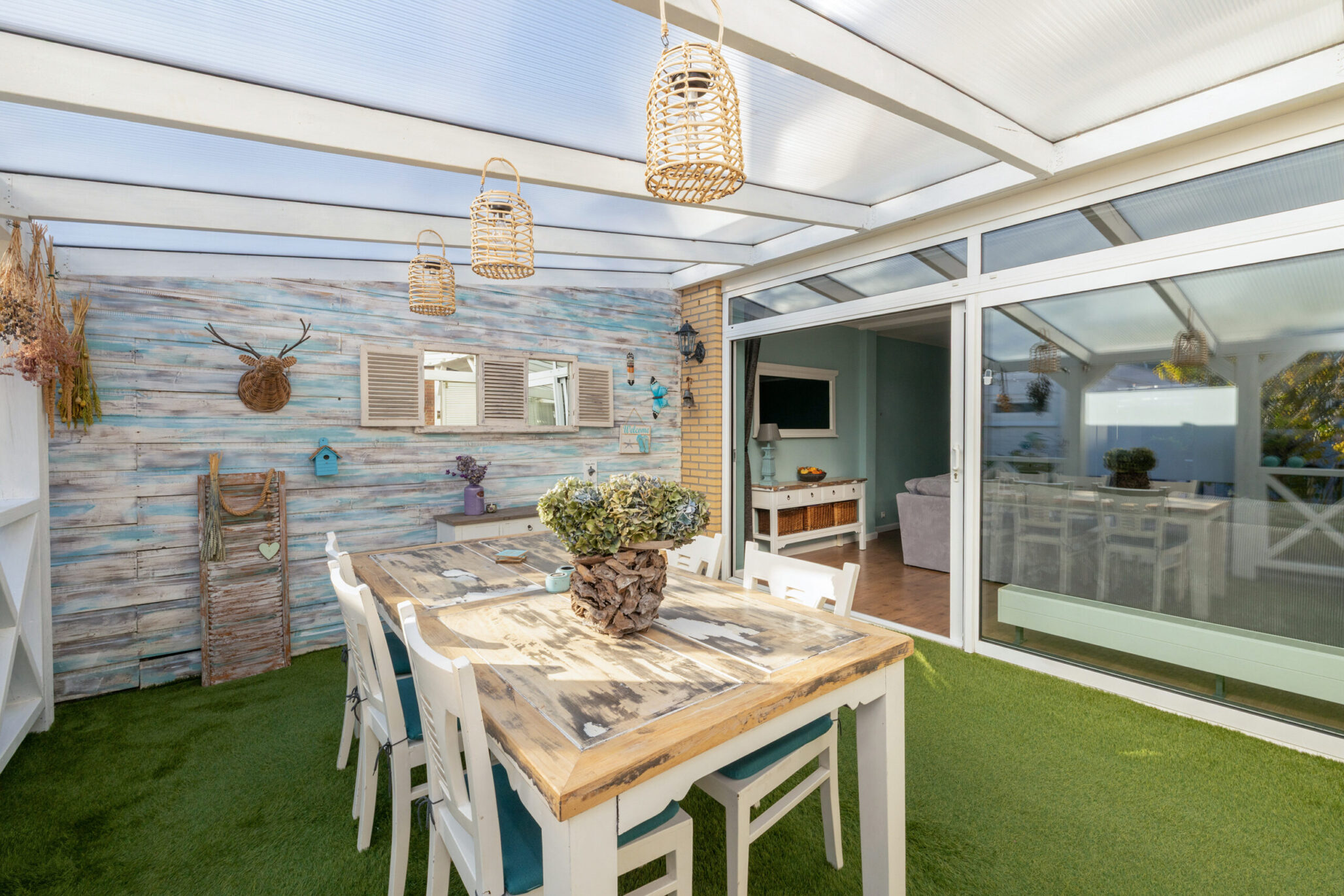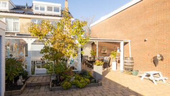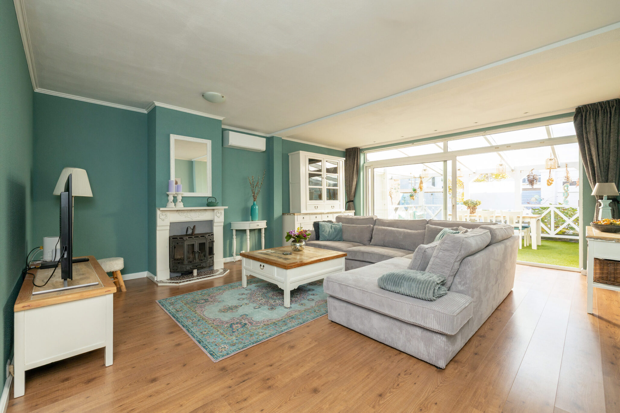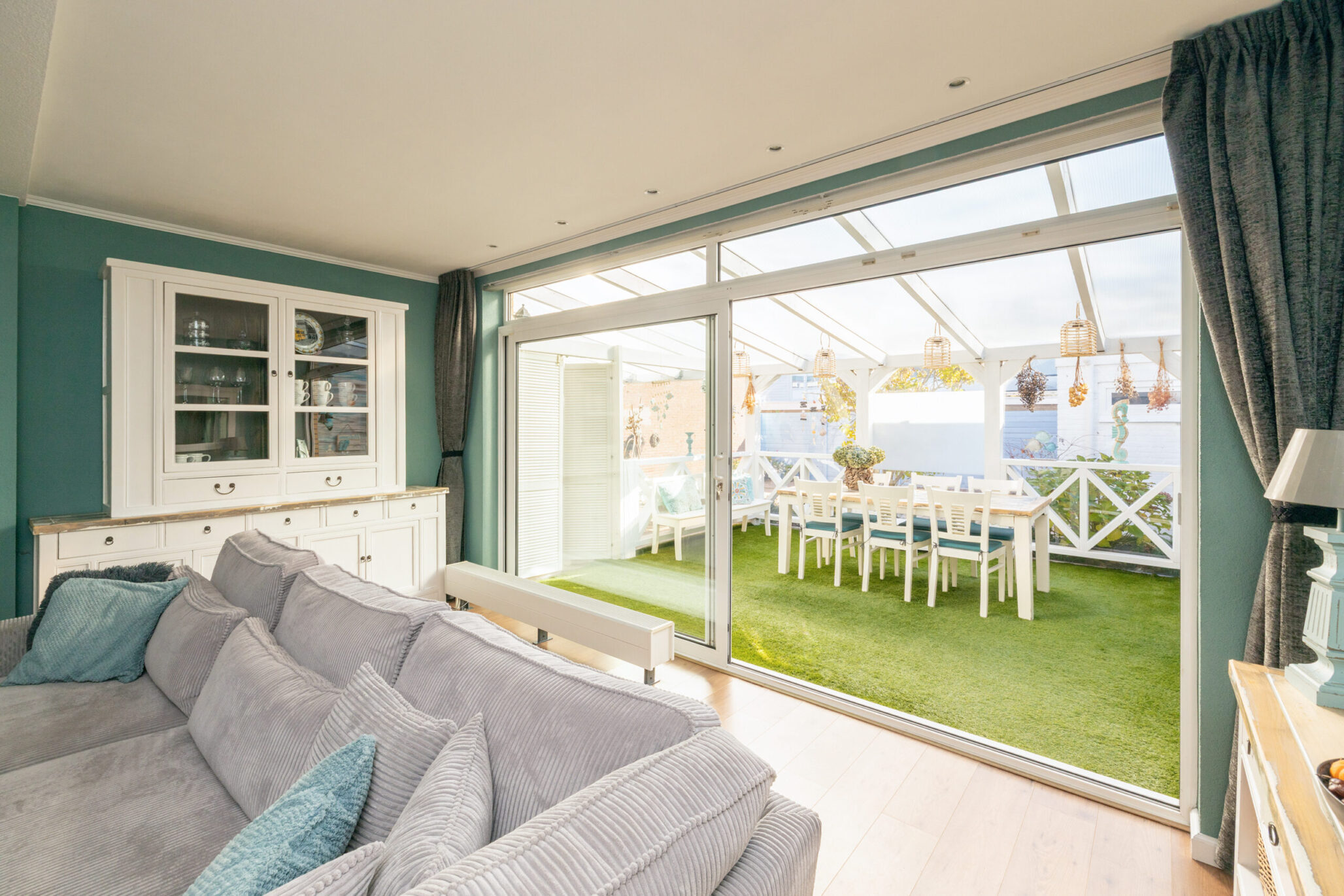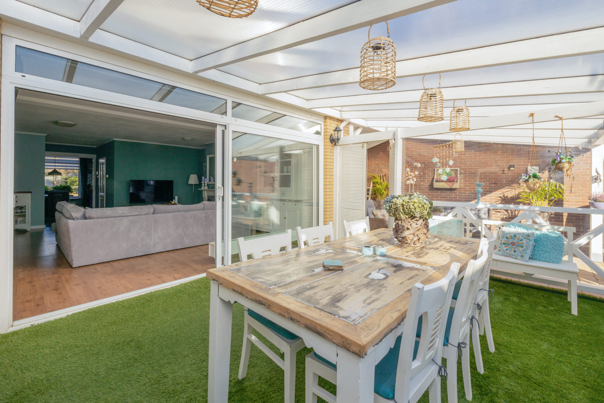 De uitgebouwde woonkamer aan de achterzijde biedt extra leefruimte en is heerlijk licht dankzij de aangebouwde serre. Deze serre vormt een verlengstuk van de woonkamer en is ideaal als tweede zitruimte of als plek om vroeg in het jaar al van de zon te genieten. Dankzij de openslaande deuren loop je zo door naar de overkapping met gezellige zithoek – perfect voor zomeravonden met familie of vrienden.