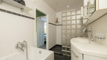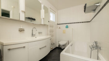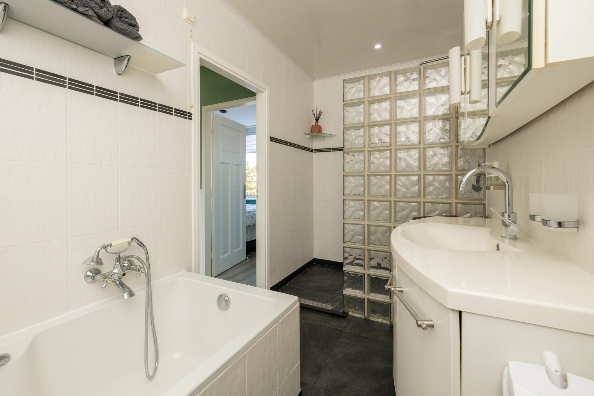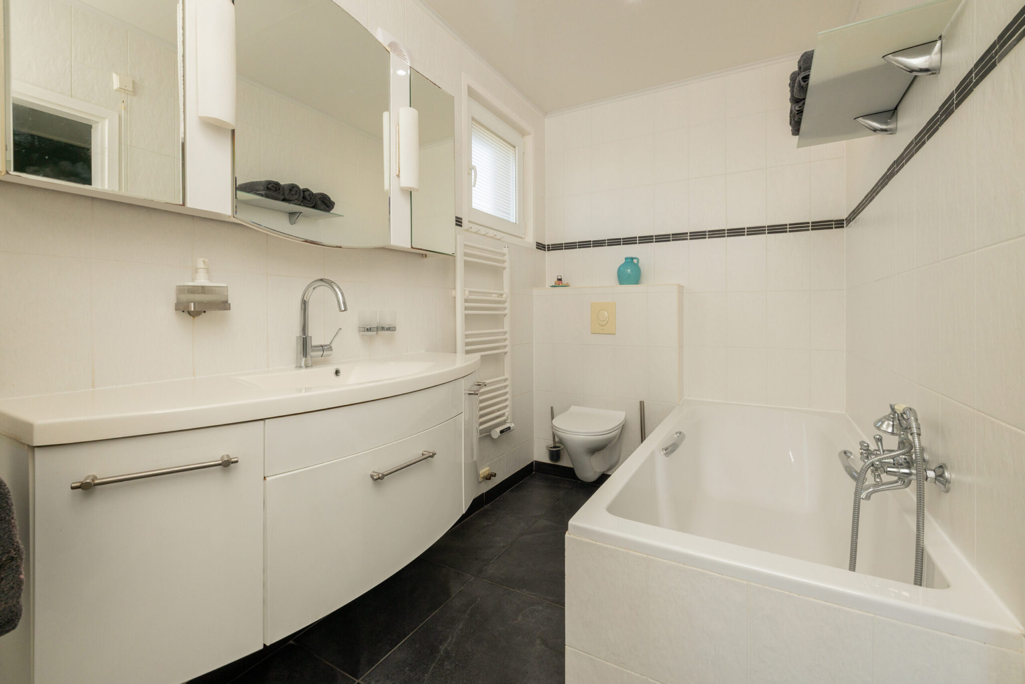 De badkamer is in 2008 vergroot en volledig vernieuwd. Uitgevoerd in een moderne zwart-witte kleurstelling met inloopdouche, ligbad, tweede toilet en wastafelmeubel. Het gestuukte plafond met inbouwspots en de vloerverwarming maakt het geheel helemaal compleet.