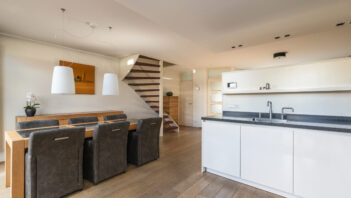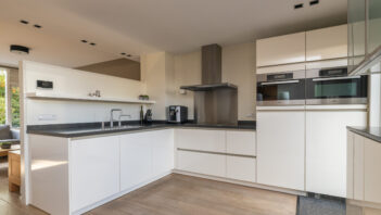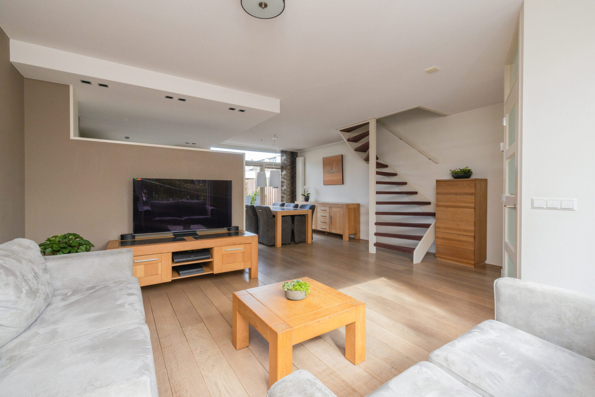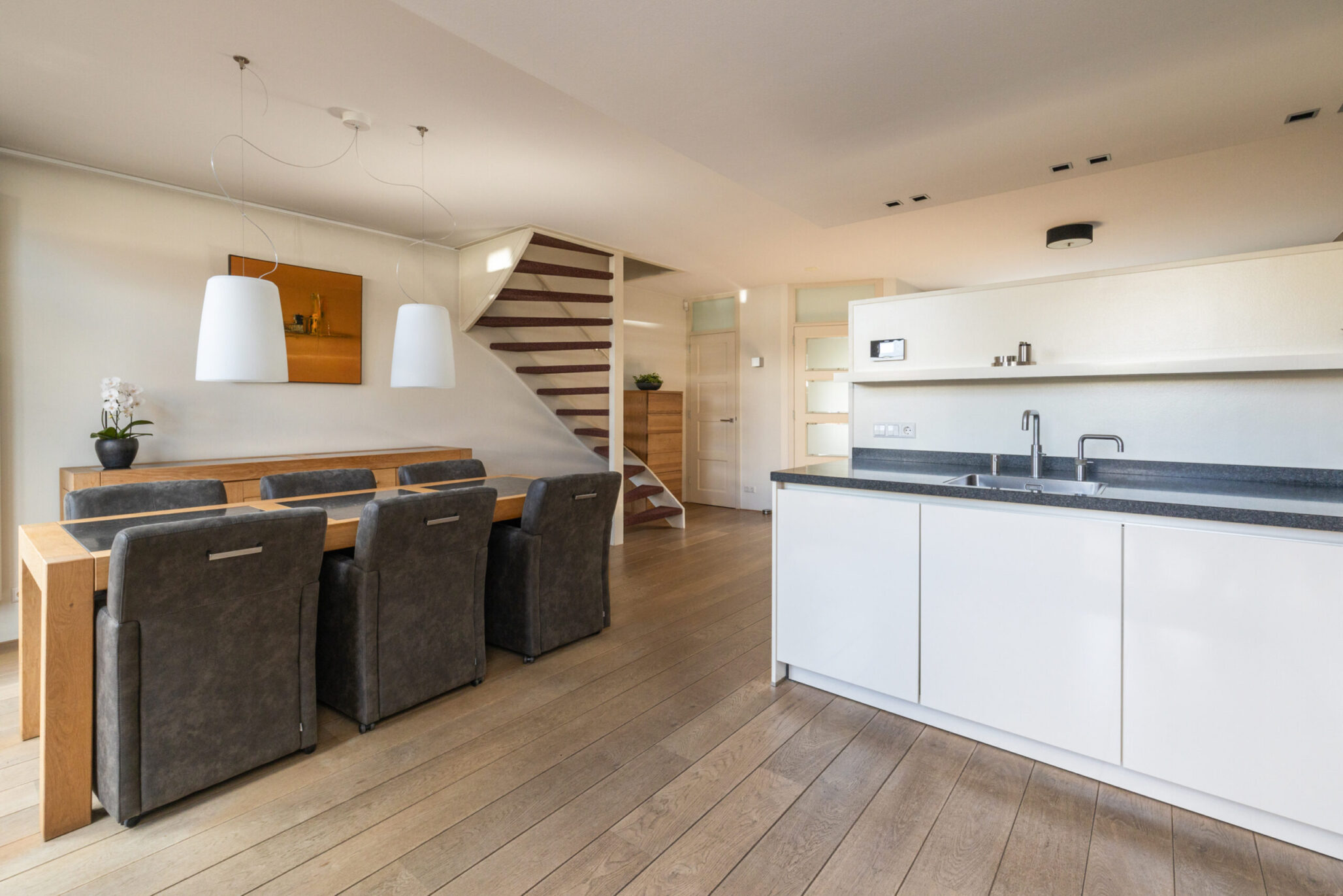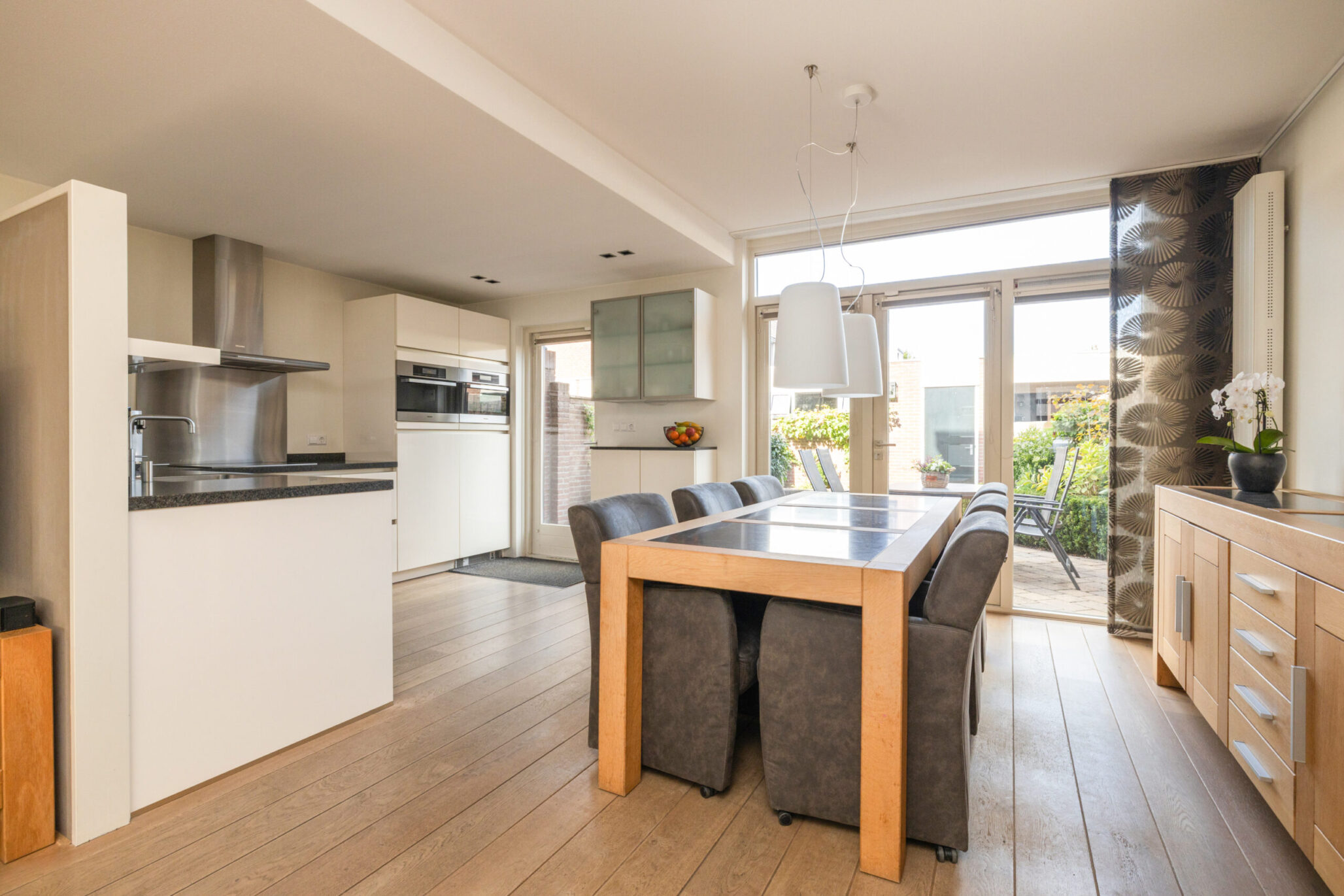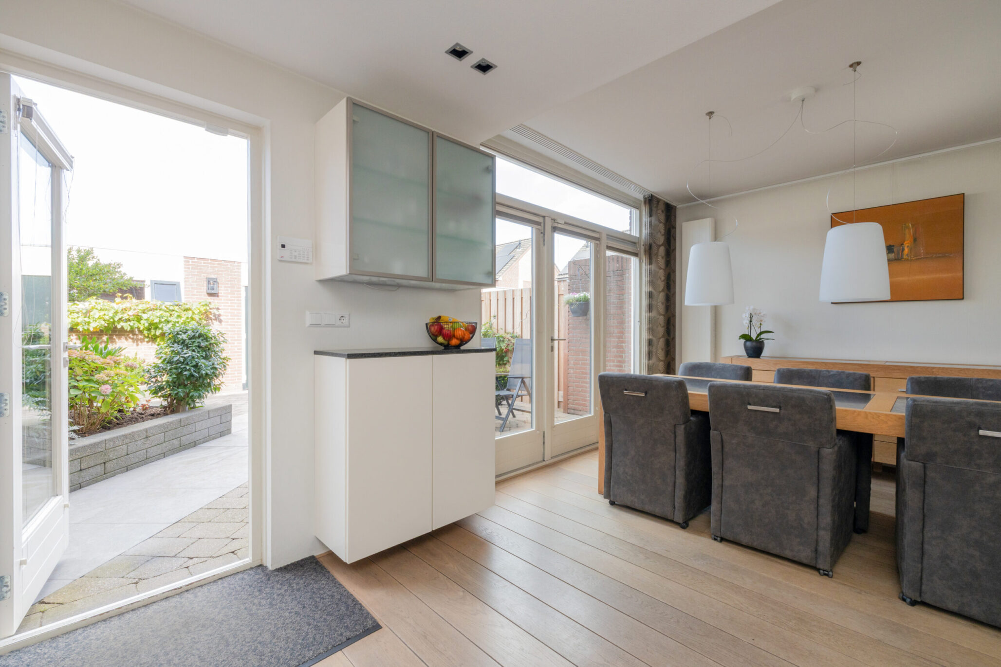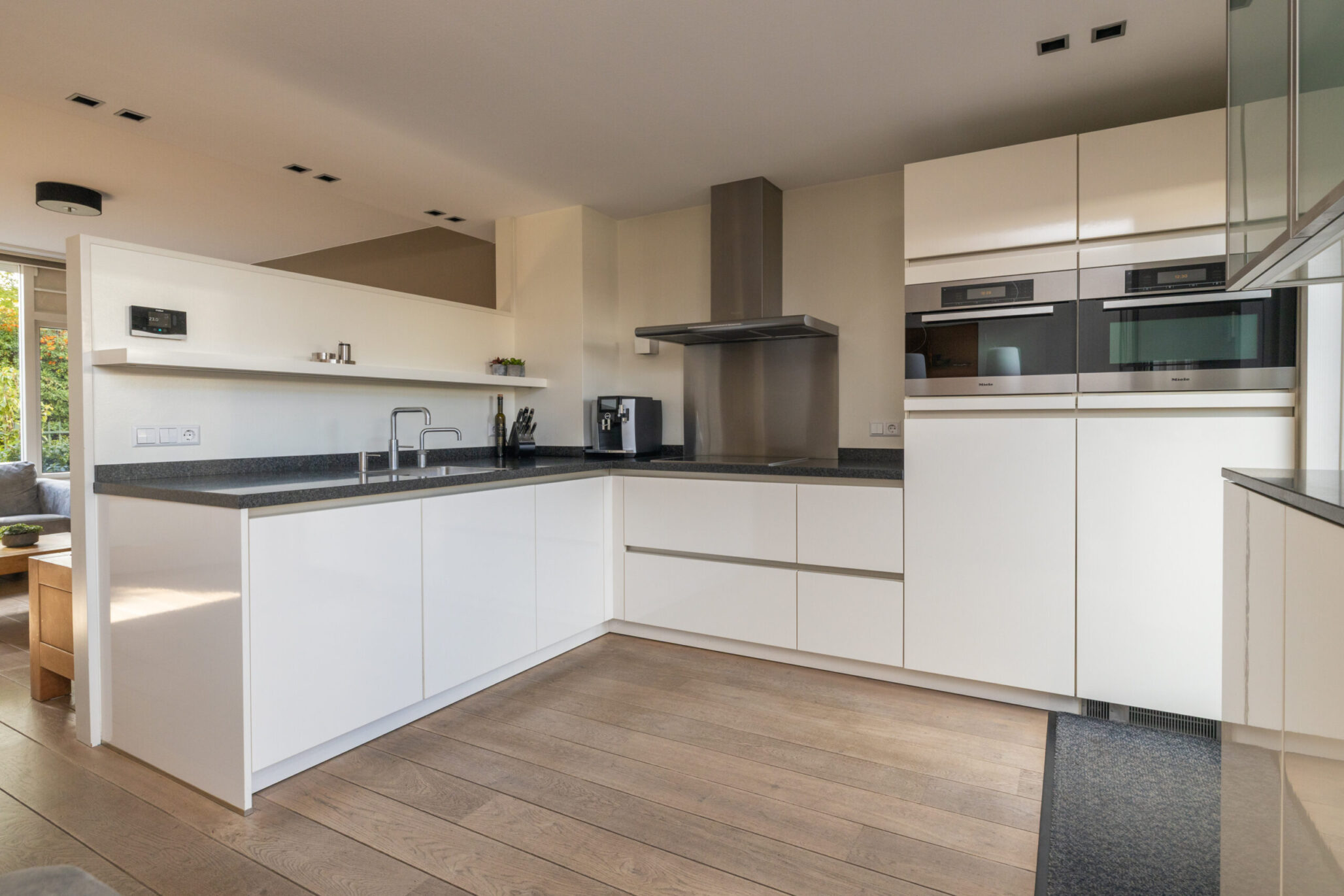 De leefruimte op de begane grond is voorzien van een eikenhouten vloer en grote raampartijen waar het daglicht mooi door binnenvalt. De woonkamer ligt aan de voorzijde en aan de tuinzijde is ruimte voor een royale eethoek naast de open keuken. Deze moderne, witte greeploze keuken is uitgerust met luxe inbouwapparatuur zoals een stoomoven, combioven, Quooker, inductiekookplaat, vaatwasser, koelkast en vriezer. Het verlaagde plafond met spotverlichting zorgt hier voor een stijlvolle sfeer.