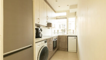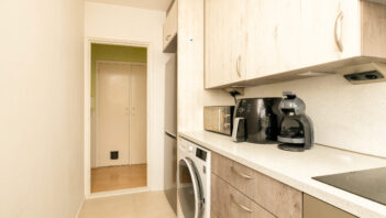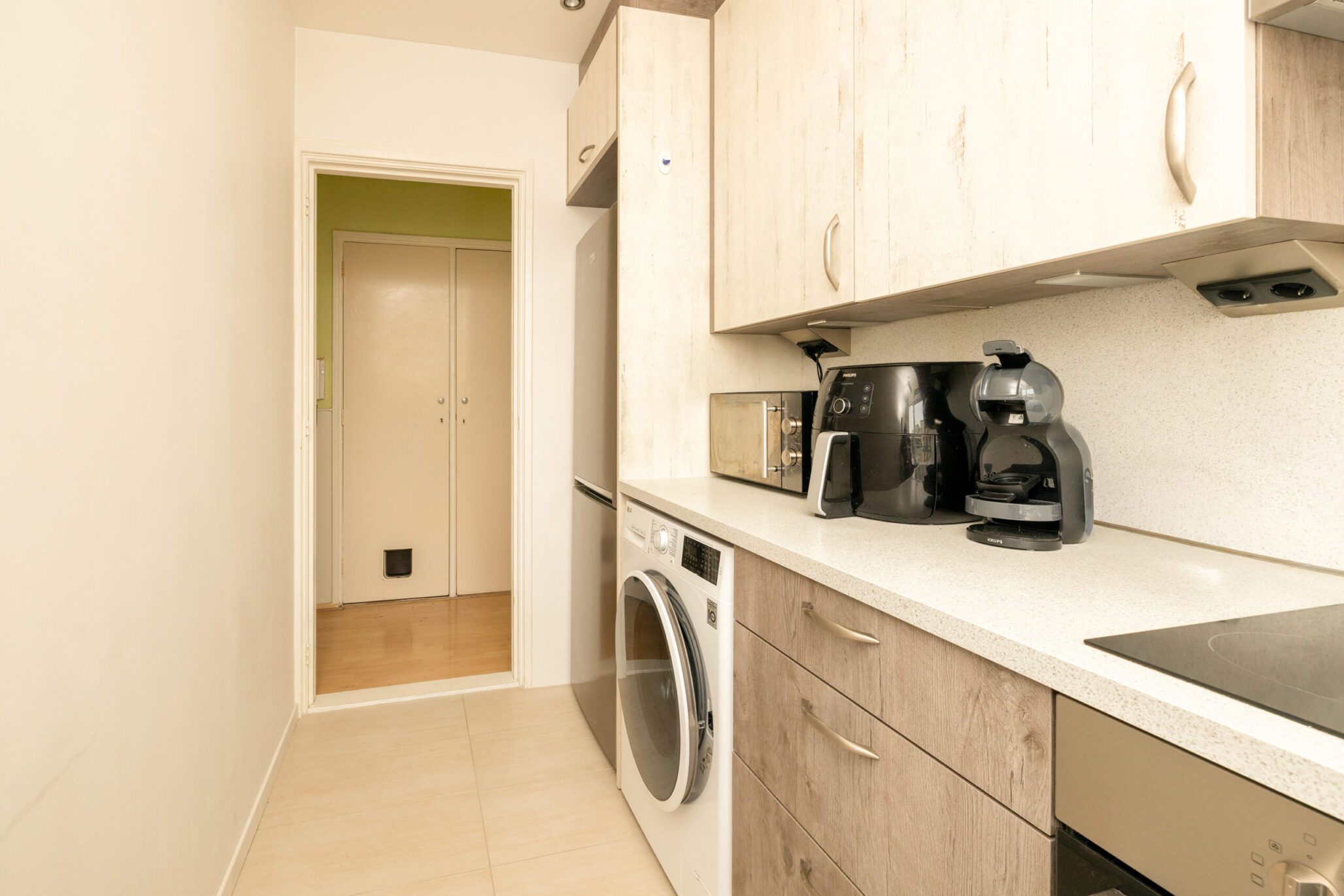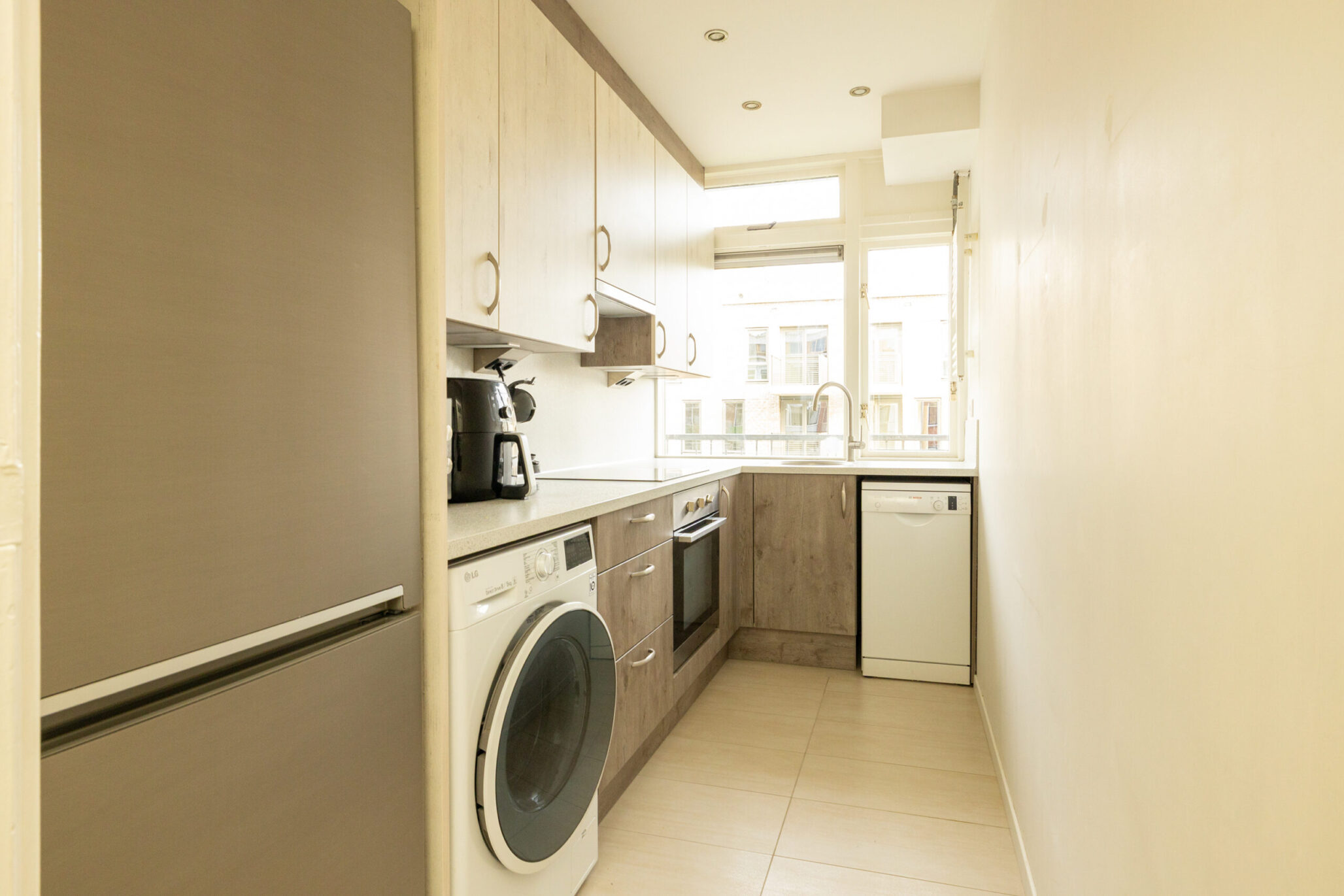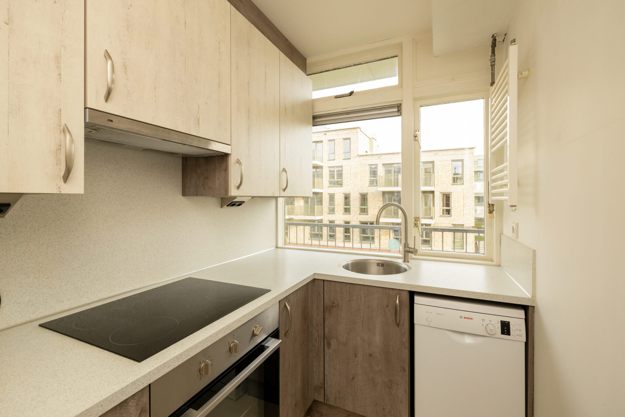 Naast de badkamer bevindt zich de moderne keuken (2018) in L-opstelling, met gestuukt plafond en inbouwspots. De keuken is uitgerust met een spoelbak met mengkraan, inductiekookplaat met afzuiging en oven, met aansluitingen voor een koelkast, vriezer, vaatwasser en wasmachine. Vanuit de keuken is er een prachtig groen uitzicht over het grasveld met bloemen en bomen. Aan de achterzijde ligt tevens de derde slaapkamer (ca. 7 m²).