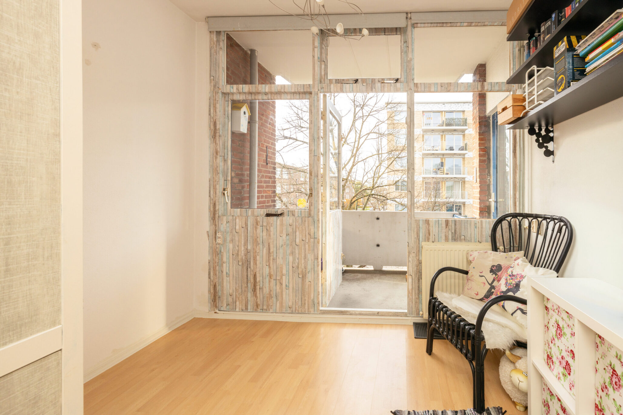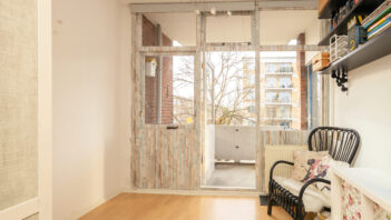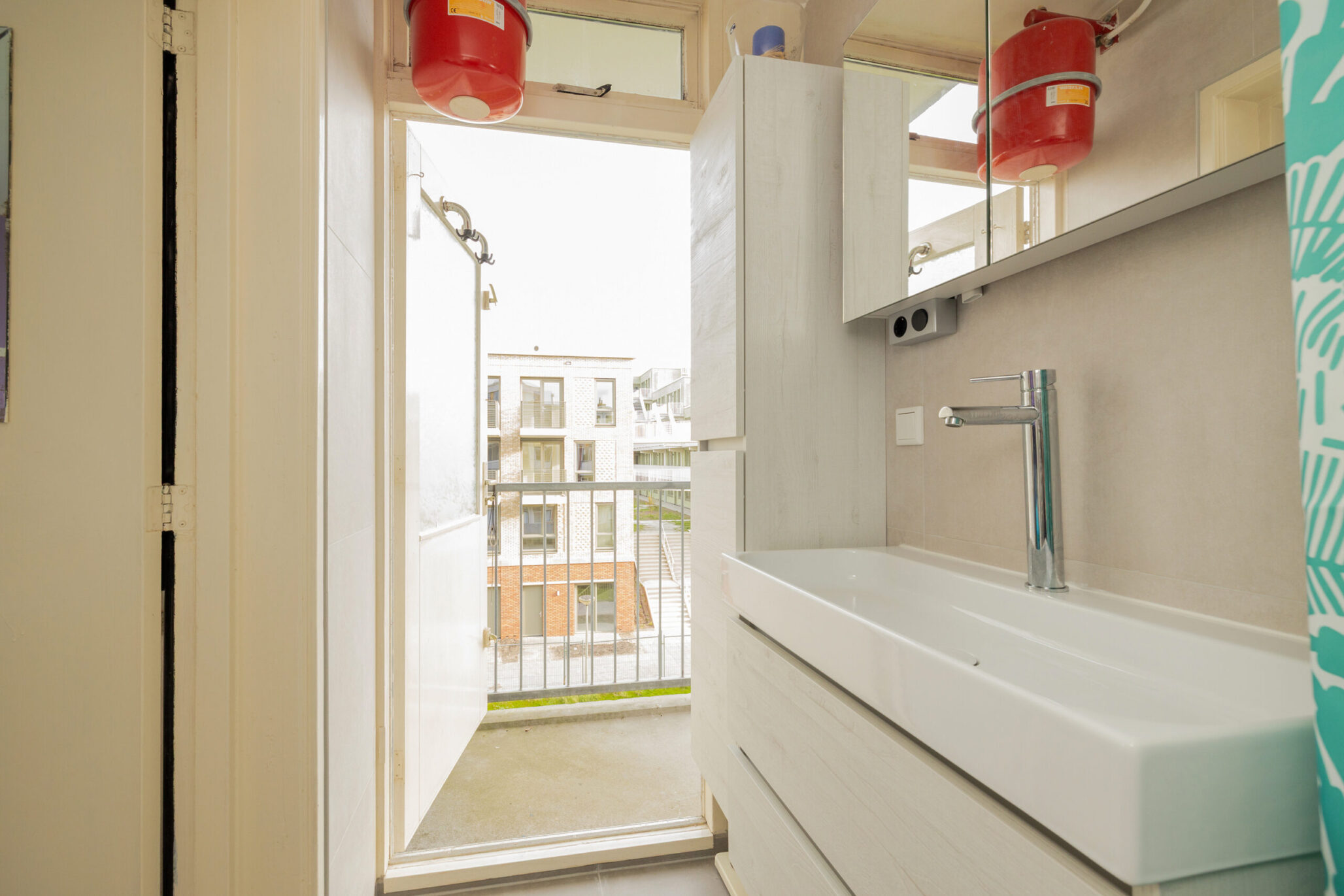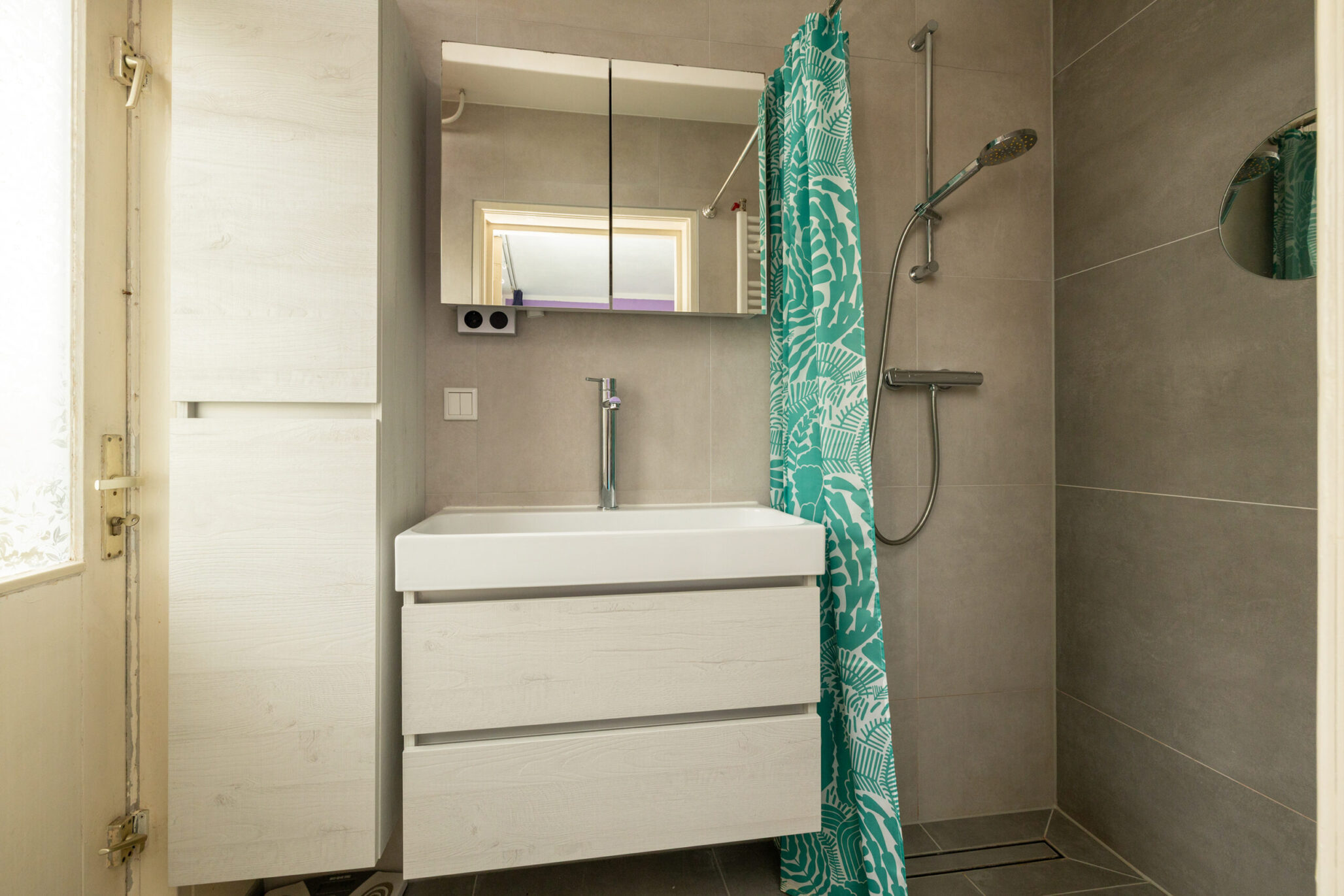 Aan de achterzijde liggen twee slaapkamers, waaronder een kamer van ca. 11 m² met directe toegang tot het achterbalkon, gelegen op het noordoosten. Vanuit deze kamer is er toegang tot de recent vernieuwde badkamer (2021), uitgevoerd in een moderne grijs-witte kleurstelling en voorzien van een stijlvol wastafelmeubel en inloopdouche.