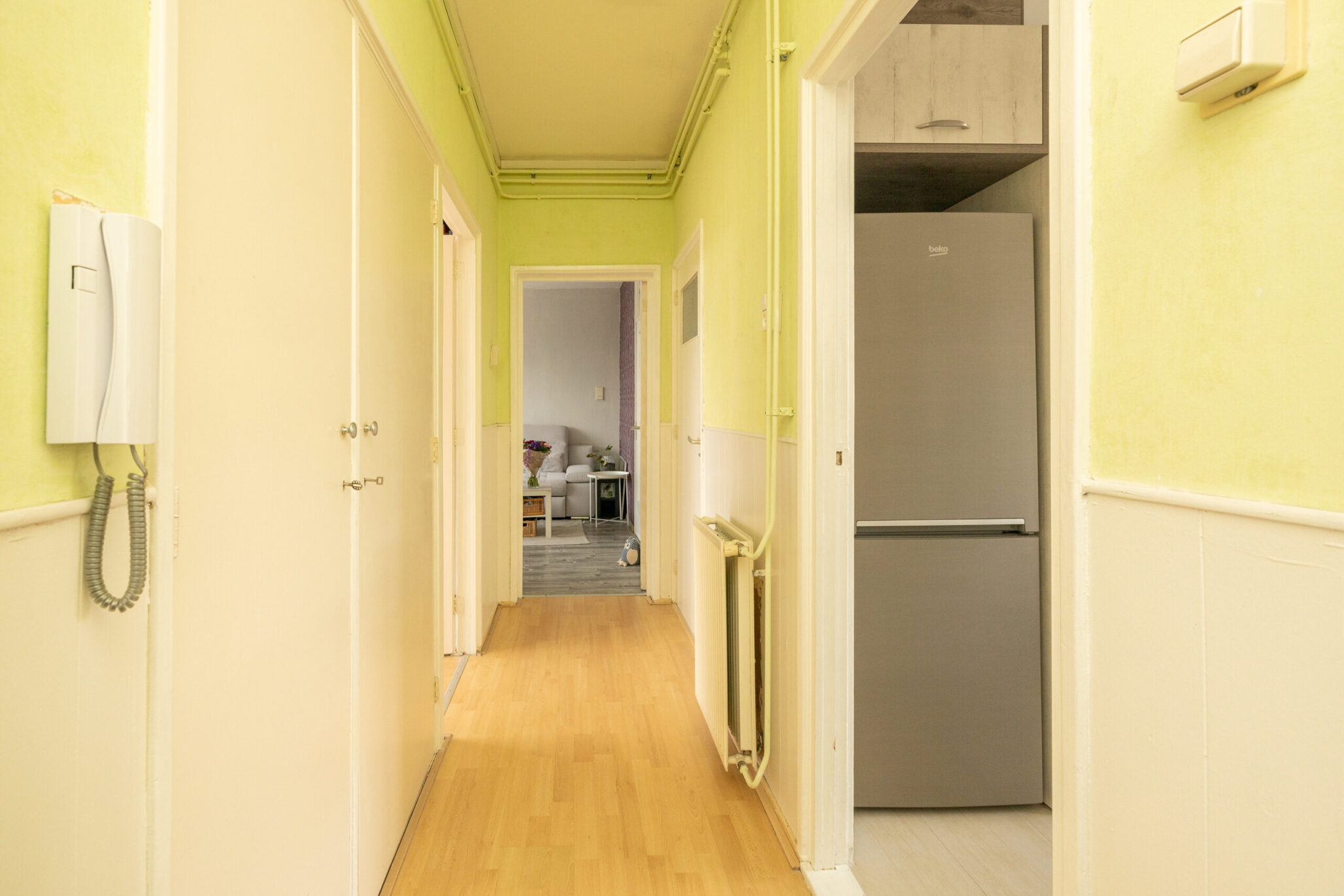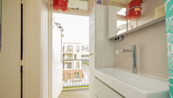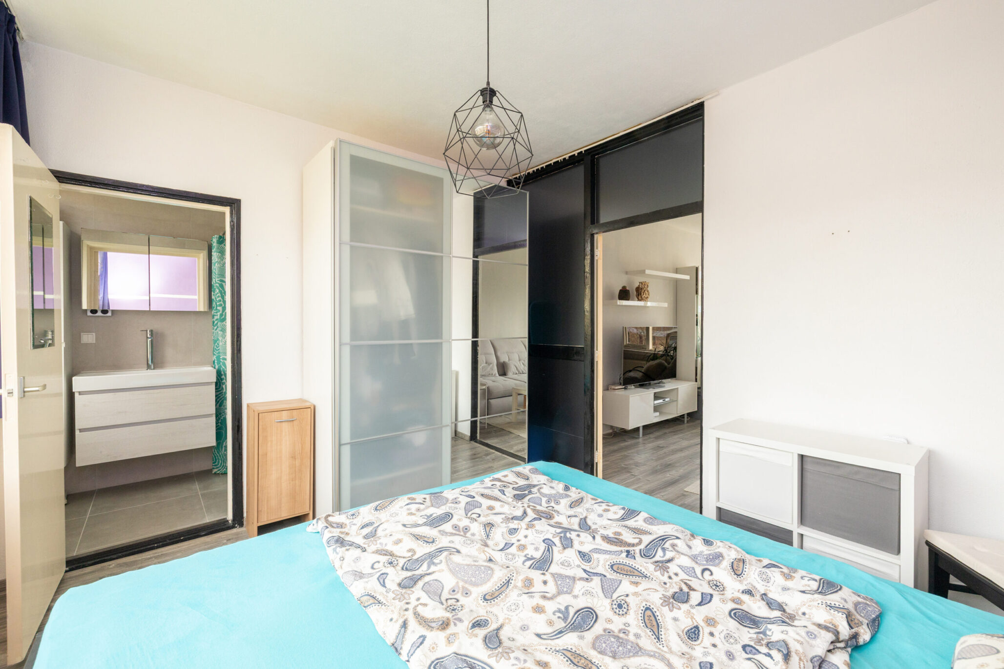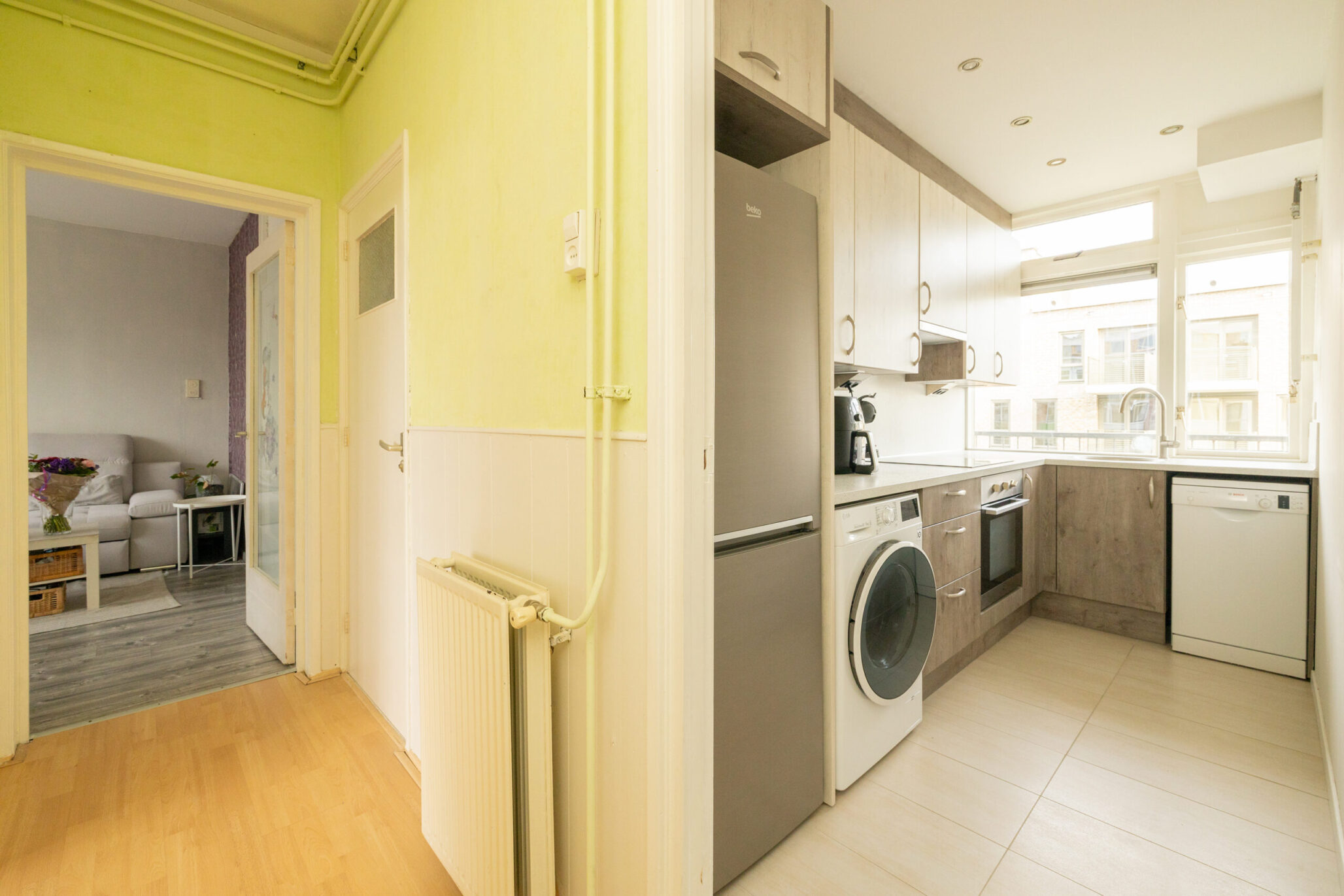 Aan de achterzijde liggen twee slaapkamers, waaronder een kamer van ca. 11 m² met directe toegang tot het achterbalkon, gelegen op het noordoosten. Vanuit deze kamer is er toegang tot de recent vernieuwde badkamer (2021), uitgevoerd in een moderne grijs-witte kleurstelling en voorzien van een stijlvol wastafelmeubel en inloopdouche.