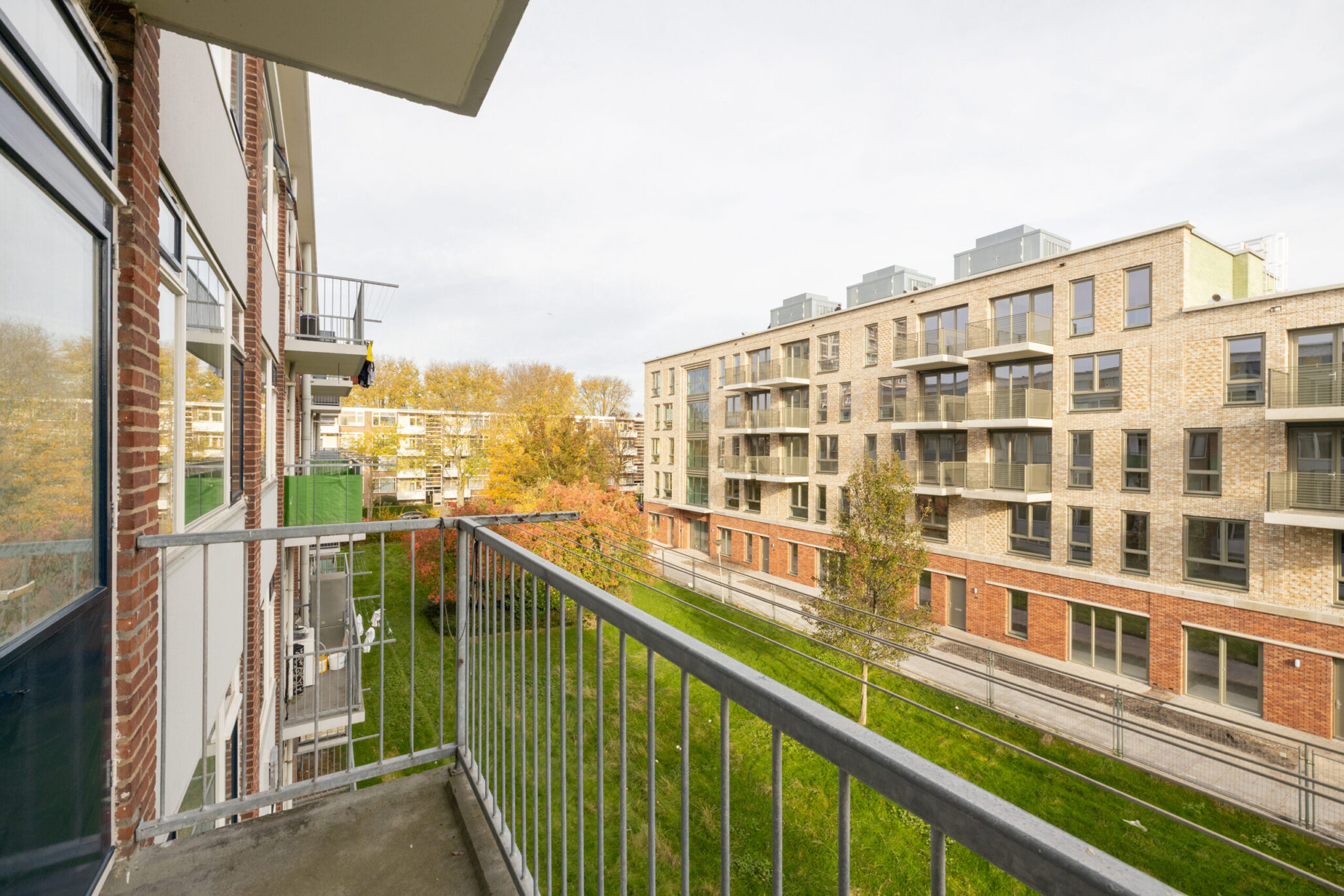 Aan de voorzijde bevindt zich de lichte woonkamer met toegang tot het zonnige balkon op het zuidwesten met uitzicht op de Vrederustlaan – een heerlijke plek om te genieten van de middag- en avondzon. Aangrenzend ligt een slaapkamer van ca. 8 m², eveneens met toegang tot dit heerlijke balkon.