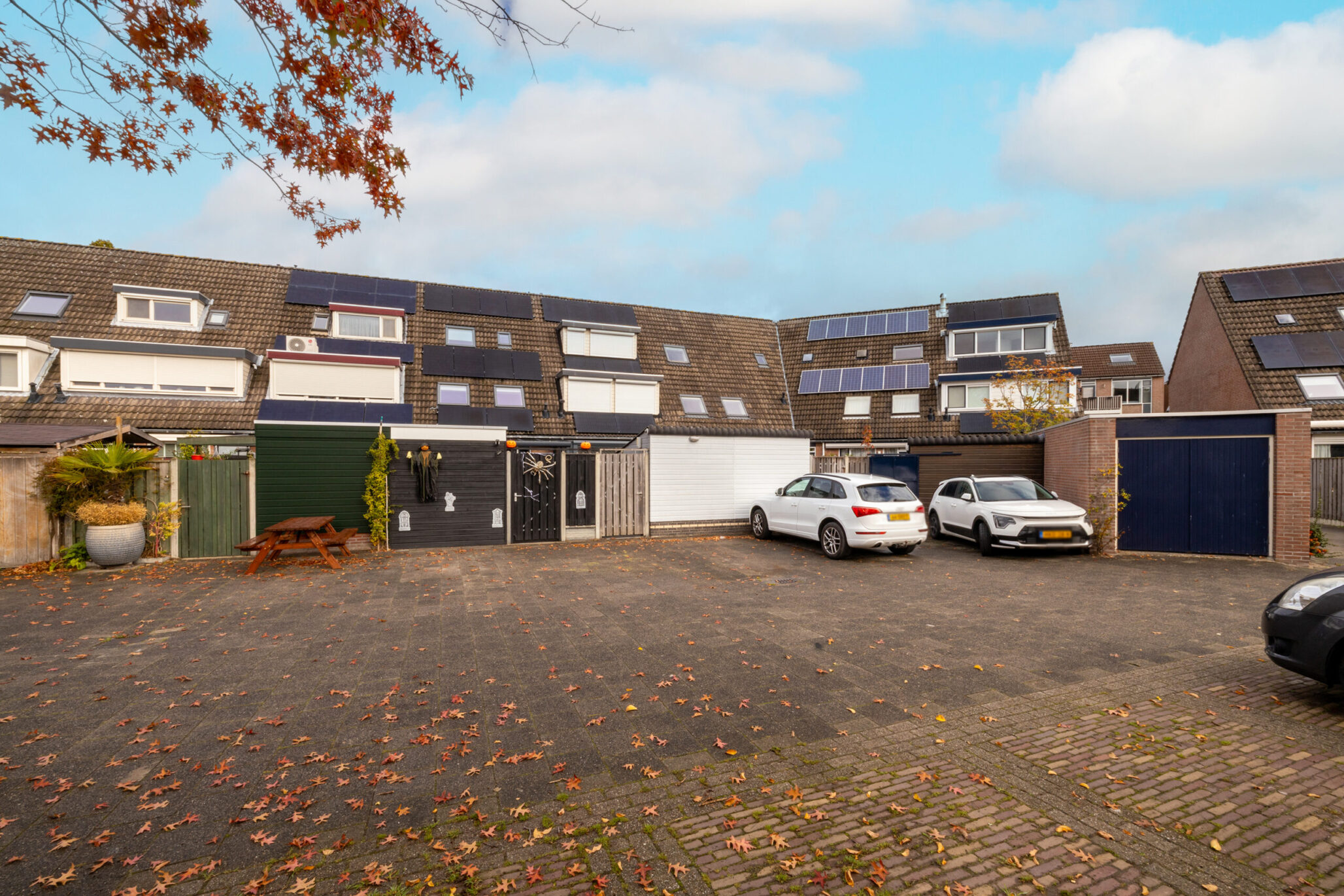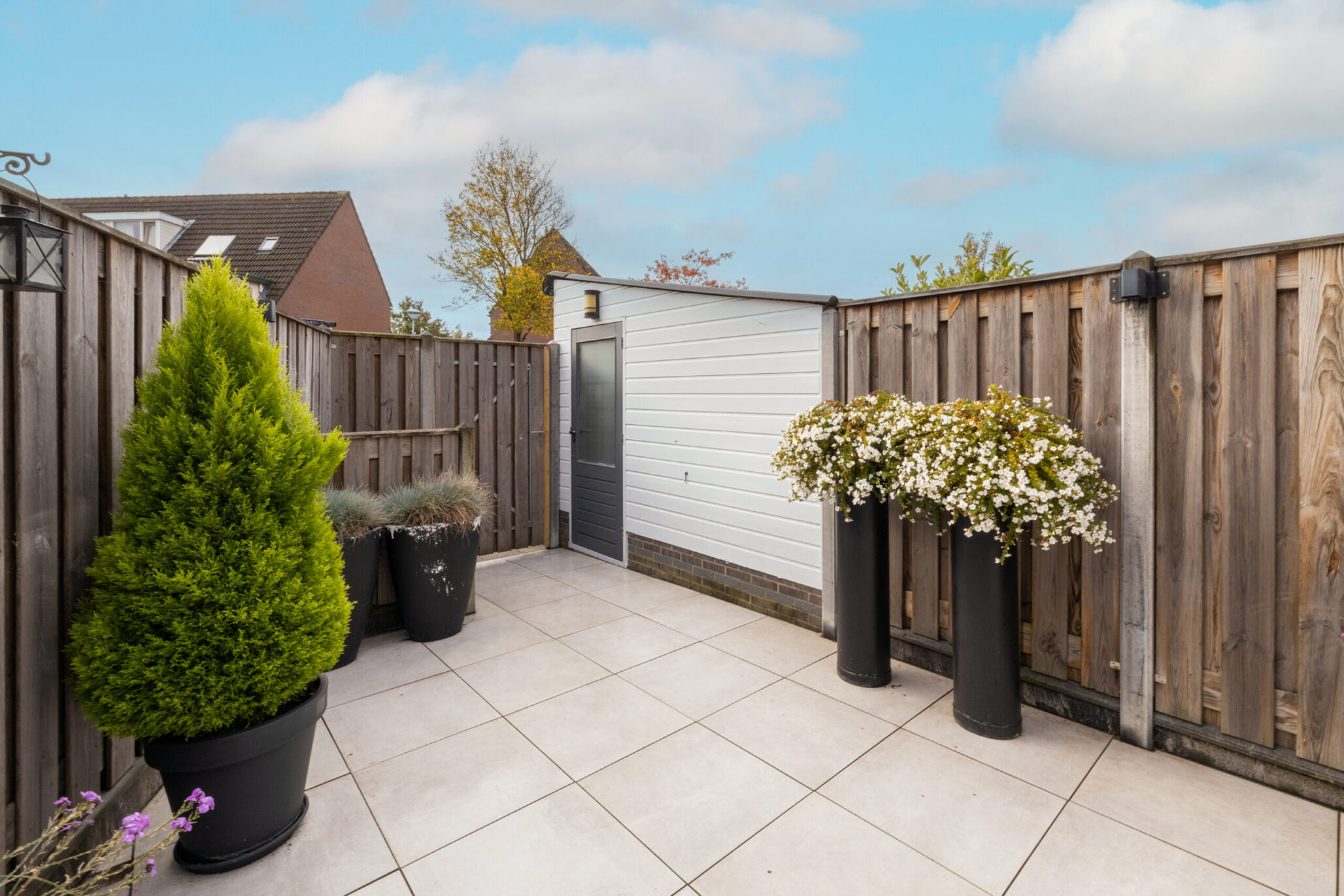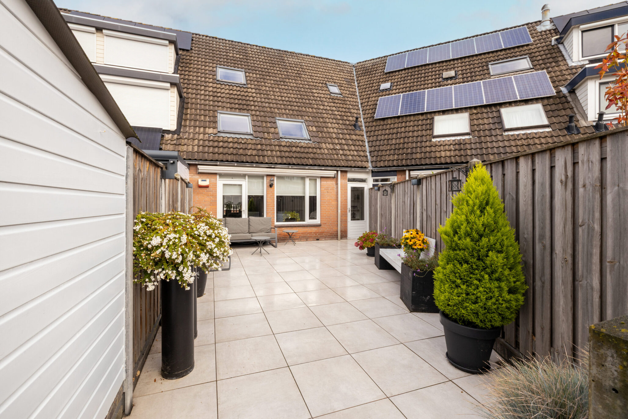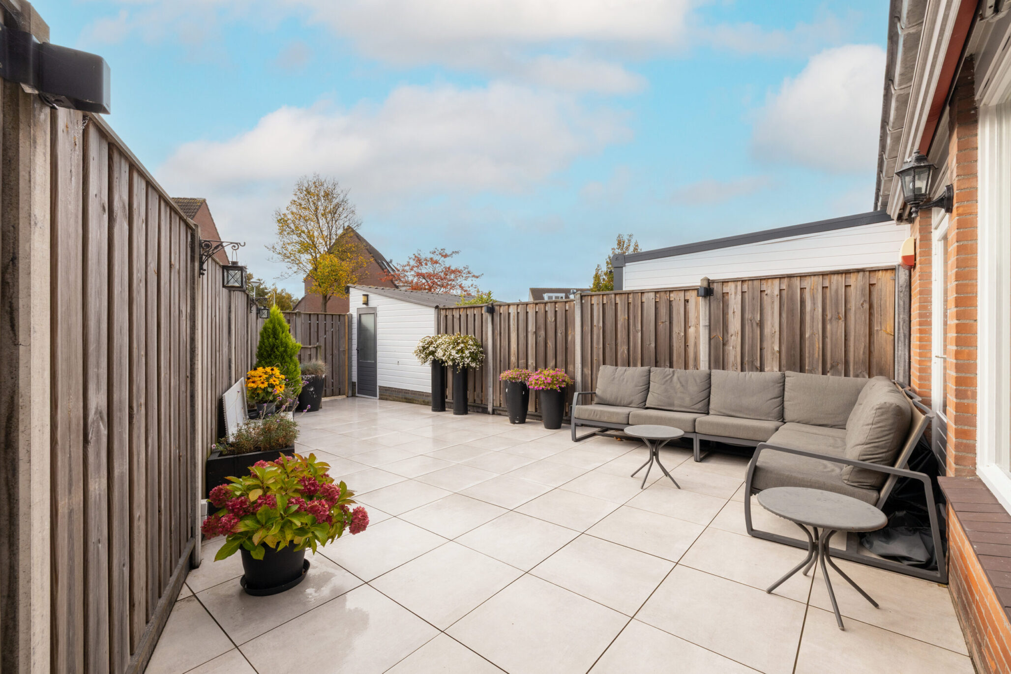 De volledig betegelde en verzorgde achtertuin op het zuiden, bereikbaar via zowel de keuken als de eetkamer, is een heerlijke, zonnige plek om te ontspannen en te genieten. Achterin de tuin bevinden zich een berging en een achterom. Direct achter de woning is ruimte om je auto te parkeren.
