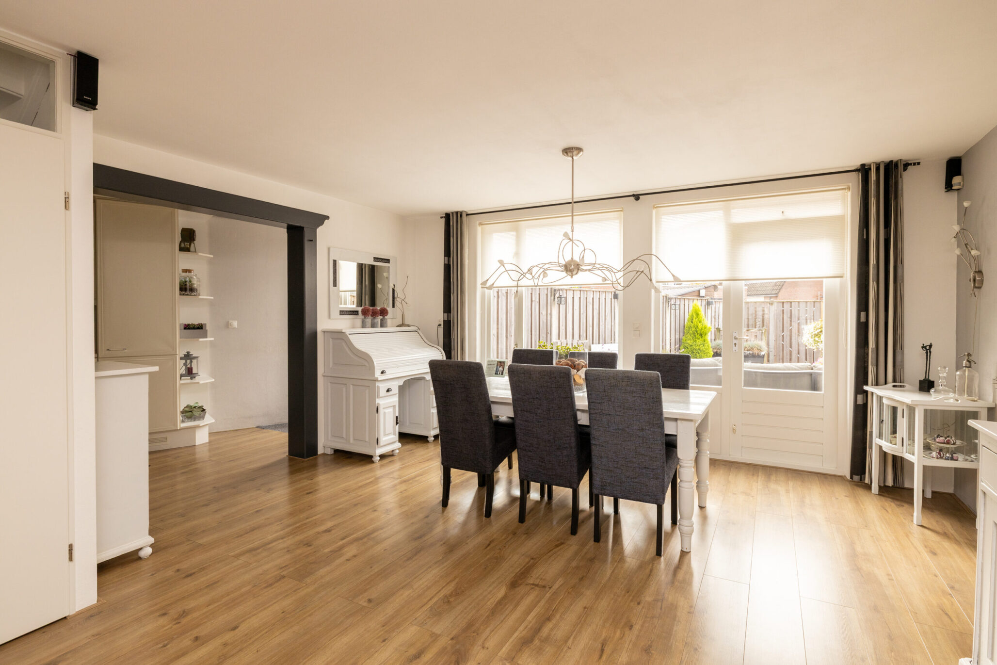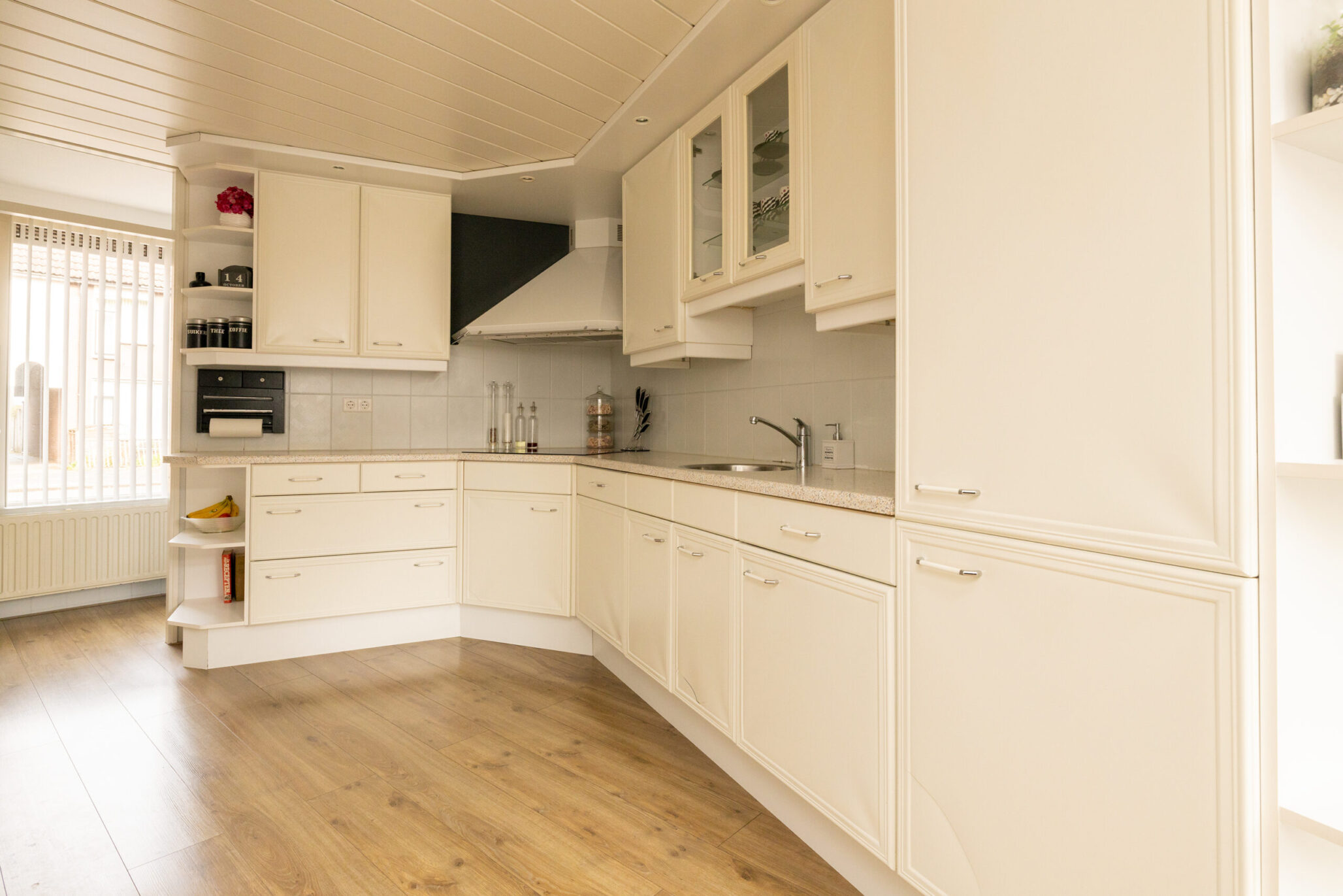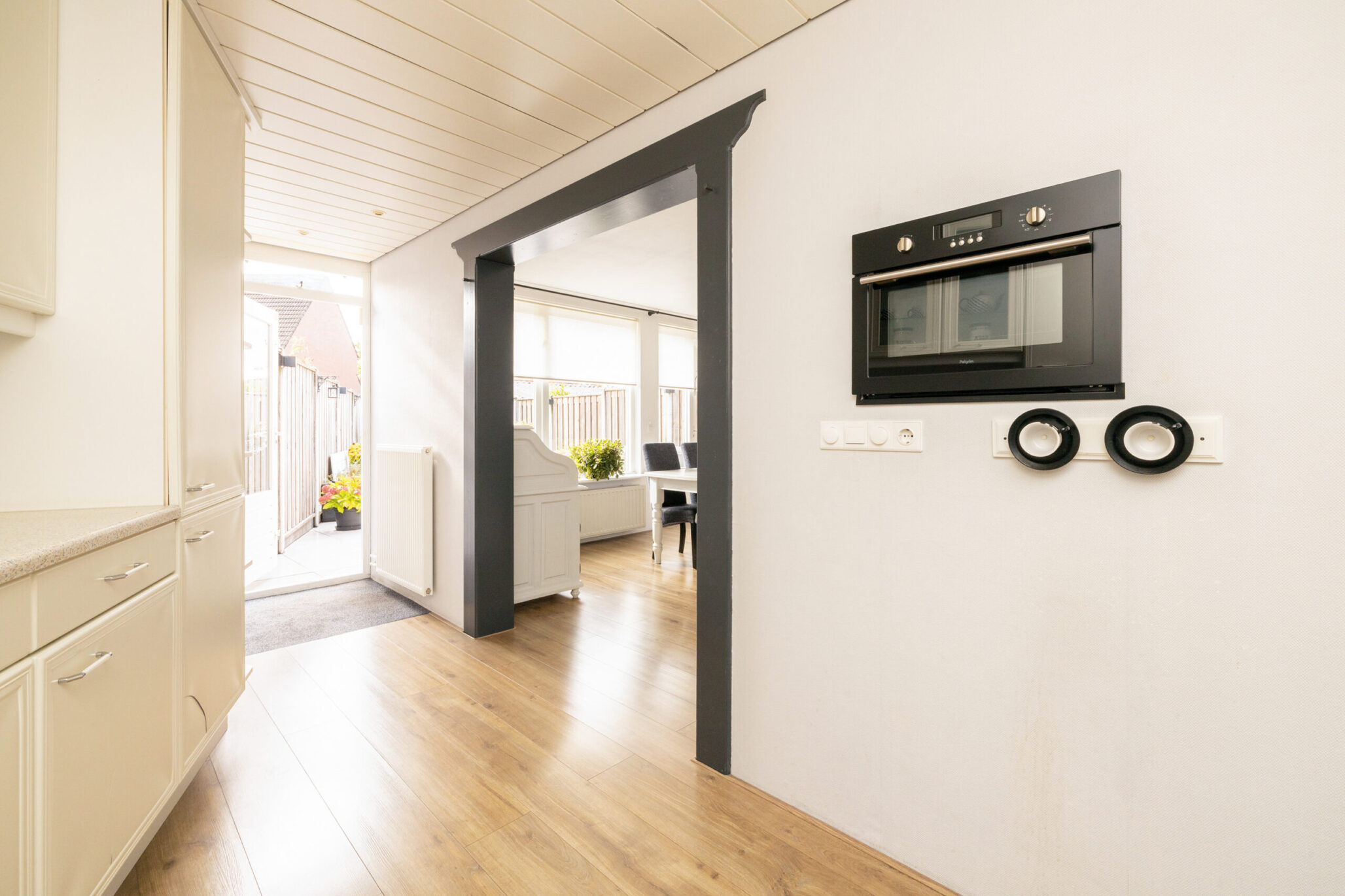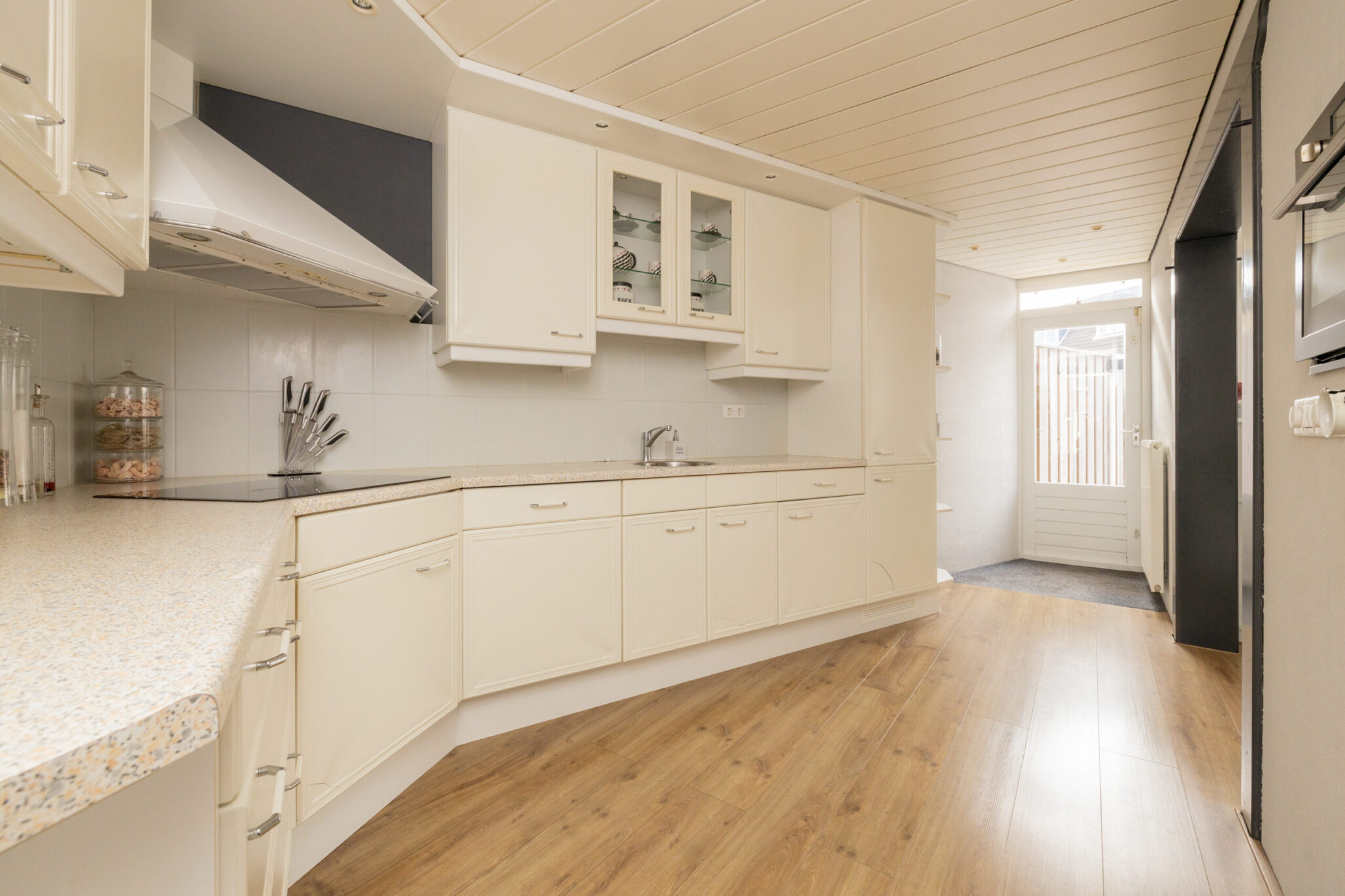Via de verzorgde voortuin stap je binnen in de hal met meterkast en ruimte voor een garderobe. Vanuit hier loop je door naar de ruime doorzonwoonkamer met laminaatvloer en strak gestuukt plafond, waar het daglicht volop binnenvalt. De praktische trapkast biedt extra bergruimte. De tuingerichte eetkamer vormt een gezellige plek om samen te komen. Vanuit het eetgedeelte bereik je de halfopen keuken in een lichte kleurstelling, voorzien van alle benodigde inbouwapparatuur, waaronder een koelkast, vriezer, inductiekookplaat met afzuigkap en vaatwasser. Aansluitend ligt de bijkeuken, ideaal voor extra bergruimte en voorzien van aansluitingen voor de wasmachine en droger. Via het tussenportaal in de woonkamer bereik je het volledig betegelde toilet met fonteintje en de trapopgang naar de eerste verdieping.