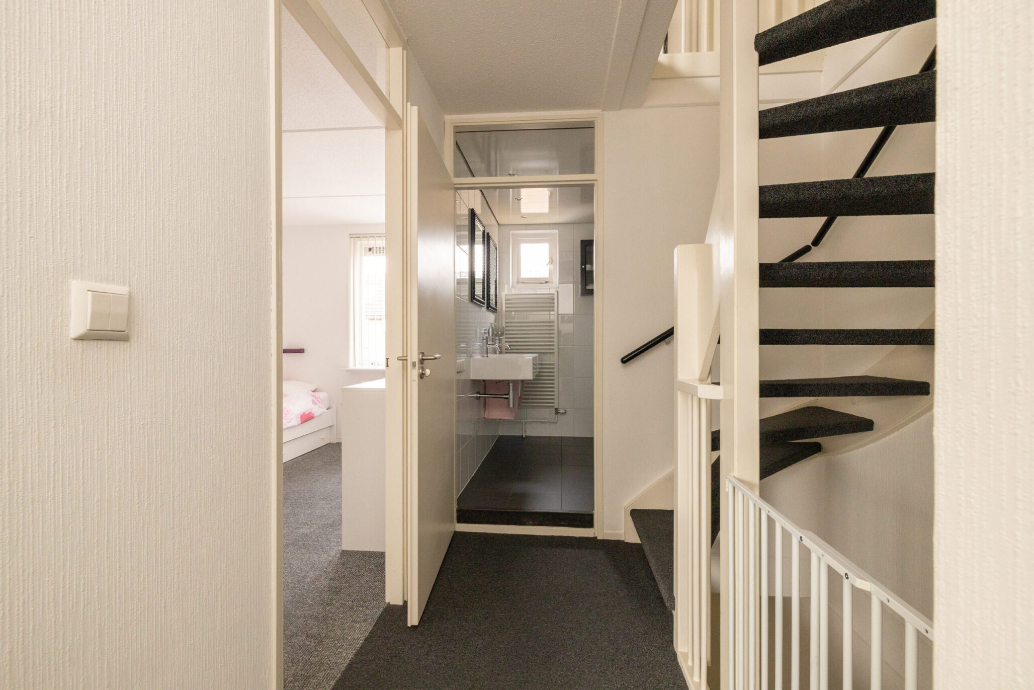 Via de vaste trap bereik je de overloop met toegang tot drie slaapkamers van ca. 14 m², 12 m² en 10 m², en de nette badkamer. De verdieping, met uitzondering van de badkamer, is voorzien van vloerbedekking, wat zorgt voor een warme uitstraling. Aan de voorzijde liggen twee ruime slaapkamers, waarvan één beschikt over een praktische vliering met opstelplaats voor de CV-combiketel, deze ruimte kan eenvoudig worden omgebouwd tot een extra (slaap)kamer. Aan de achterzijde ligt een slaapkamer met een schuin dak en twee dakramen, die zorgen voor veel natuurlijk licht en een ruimtelijk gevoel. Ook aan de voorzijde van de woning bevindt zich de nette, volledig betegelde badkamer in een tijdloze zwart-wit kleurstelling. Deze is uitgerust met inbouwspots, een dubbele wastafel, een tweede toilet en een inloopdouche met twee openslaande deuren.