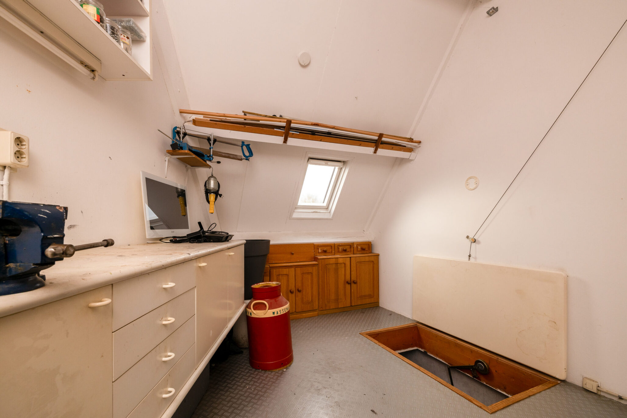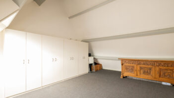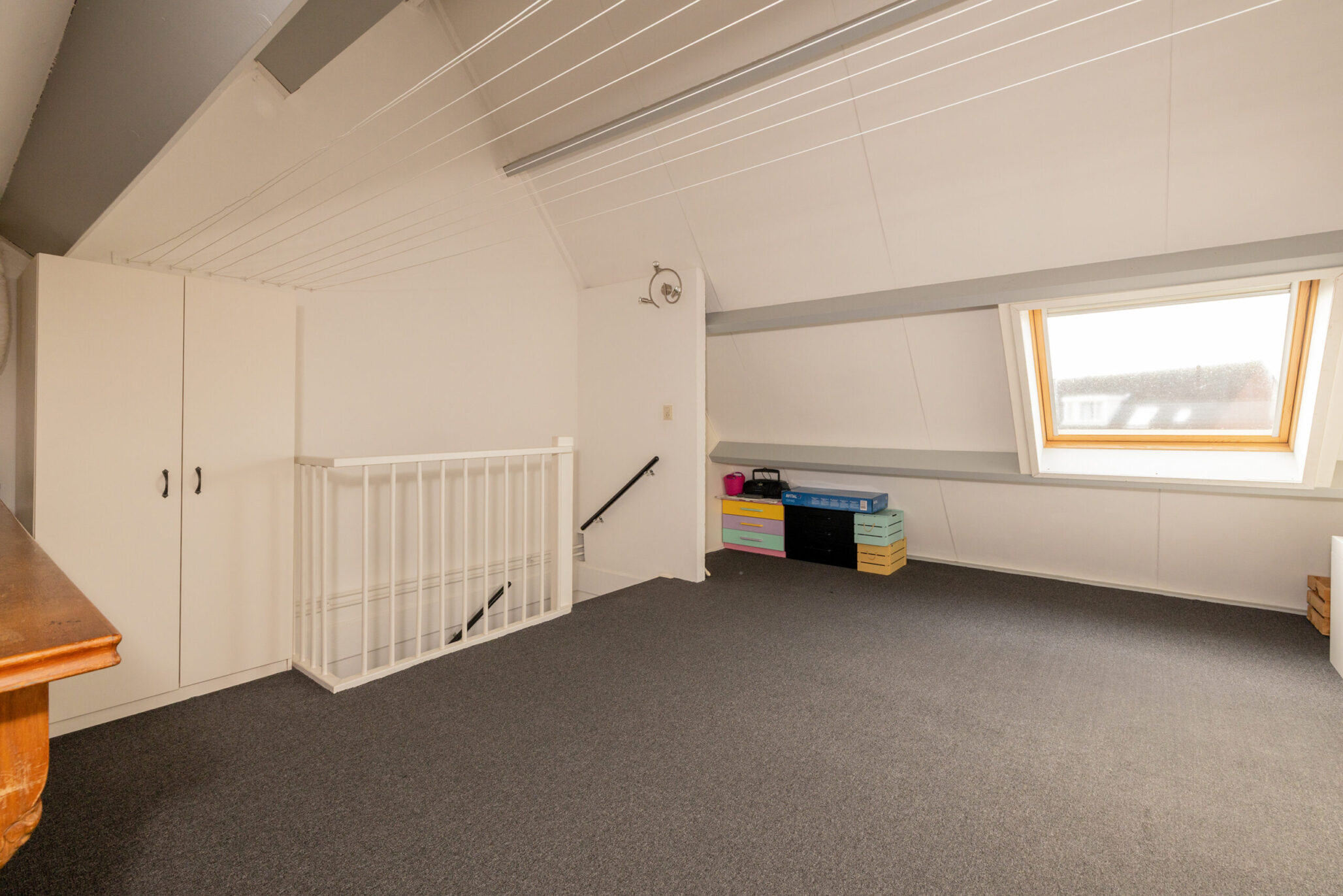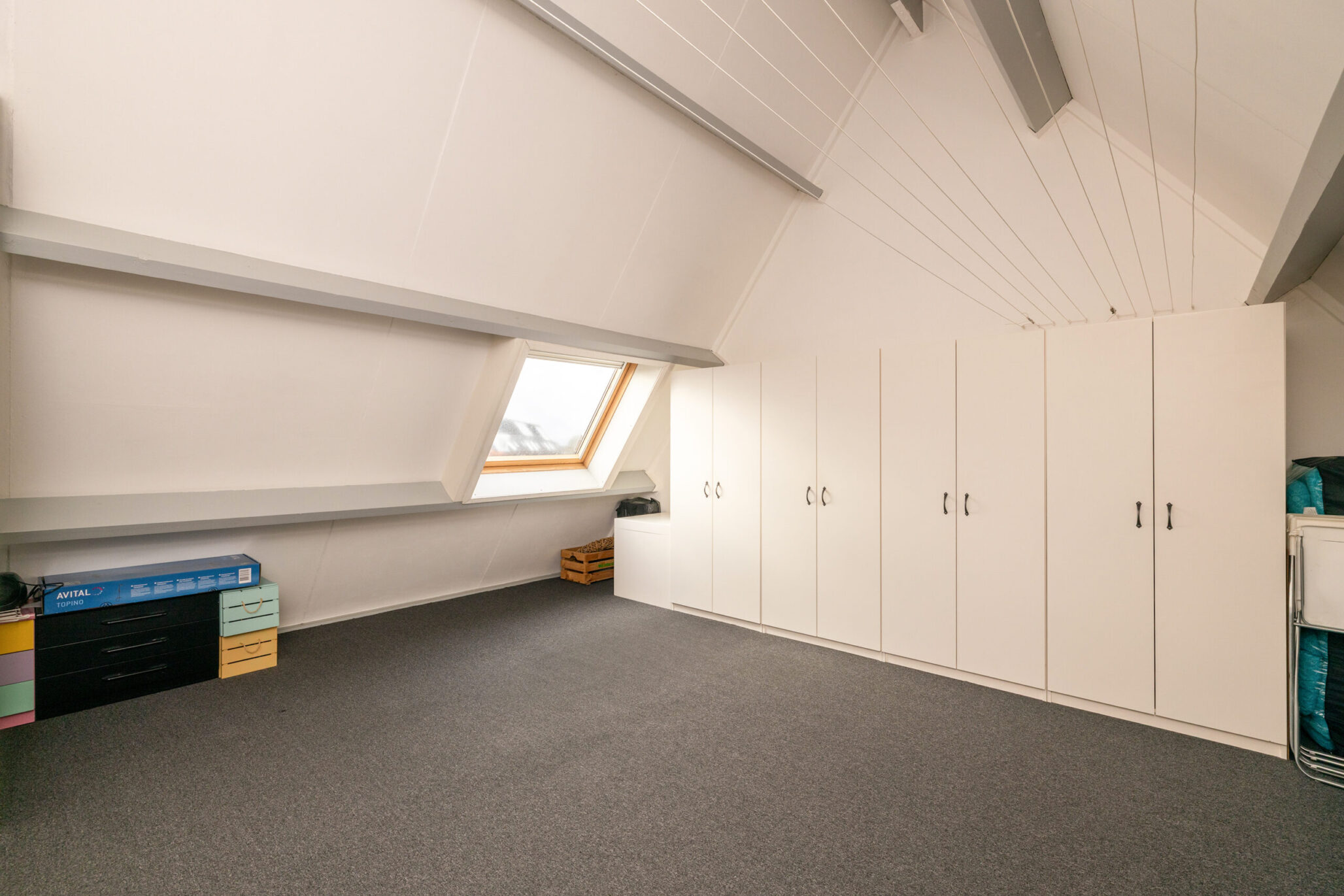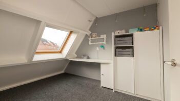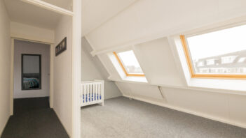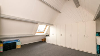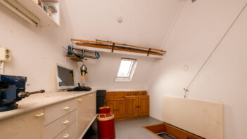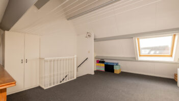 De bovenste verdieping is bereikbaar via een vaste trap en biedt een ruime zolderkamer/slaapkamer, die ook uitstekend te gebruiken is als werk- of hobbyruimte. De ruimte is netjes afgewerkt en voorzien van vloerbedekking, wat bijdraagt aan een warme uitstraling, en beschikt over een dakraam dat zorgt voor prettig daglicht.